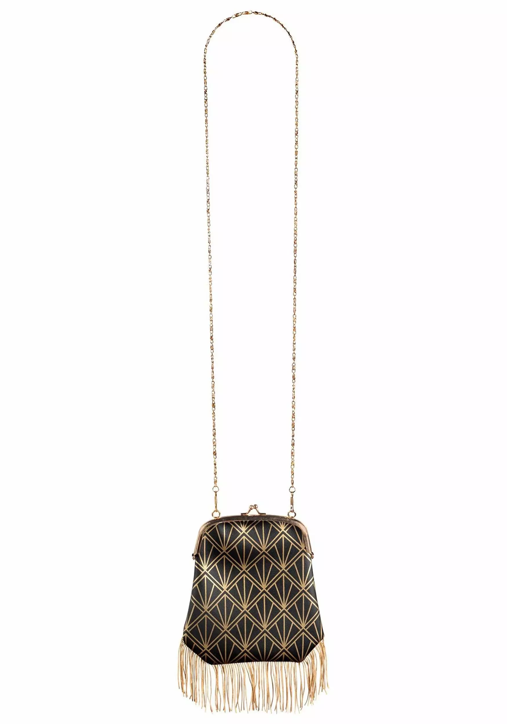 It may not look as flashy as expected, but this 1920’s Flapper Handbag is exactly what your costume needs! Inspired by the small handbags women in the 20s carried, this simple accessory is the all-day bag the era was missing. Combining the understated style of daytime bags with the glitz and glam of evening bags, you’ll be ready for any occasion without switching handbags! Store your compact, coins, and smaller essentials inside the sophisticated black satin bag. The golden hardware keeps everything safe inside while the attached tassels and an art deco print make a fashionable statement all whenever you need!