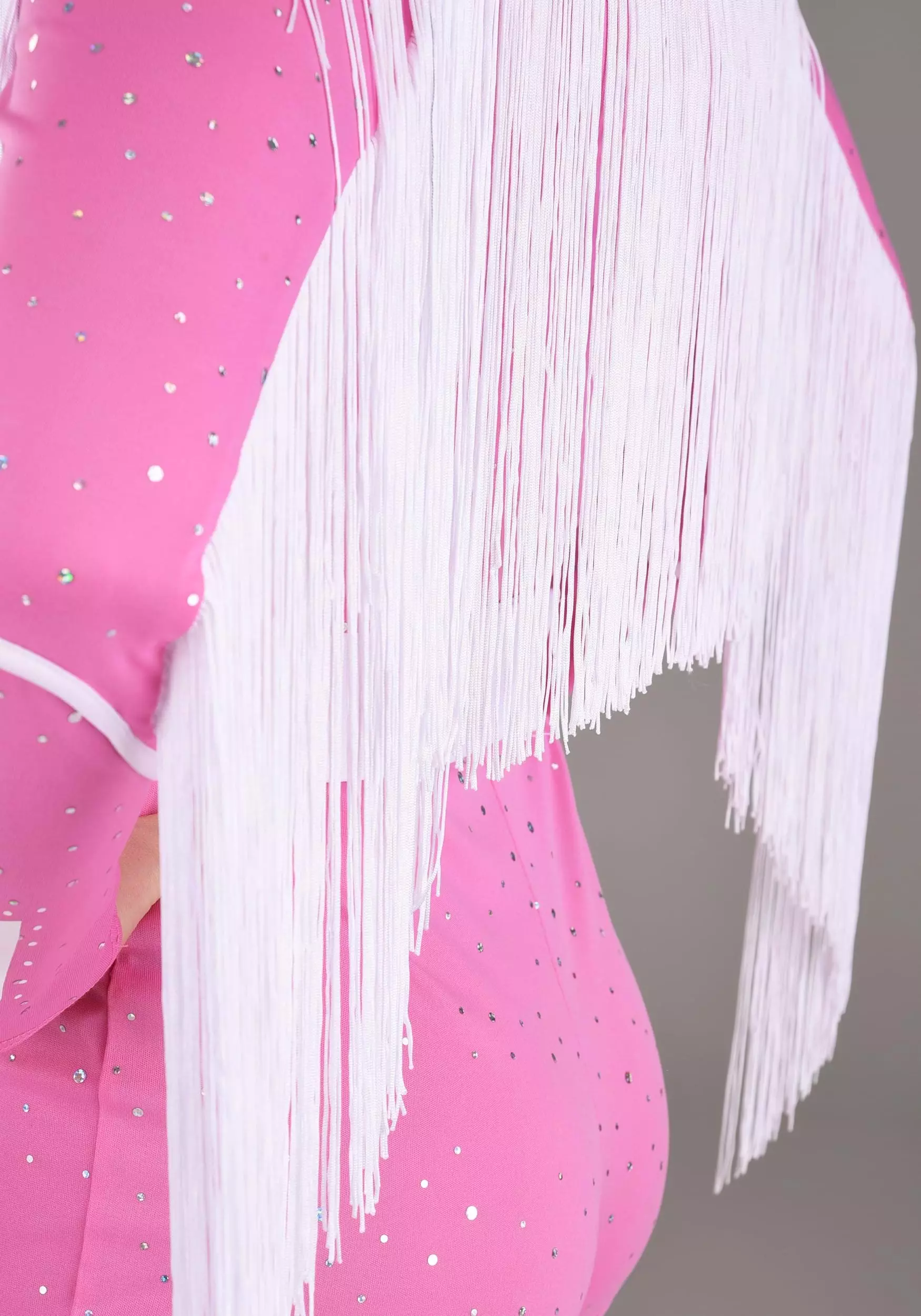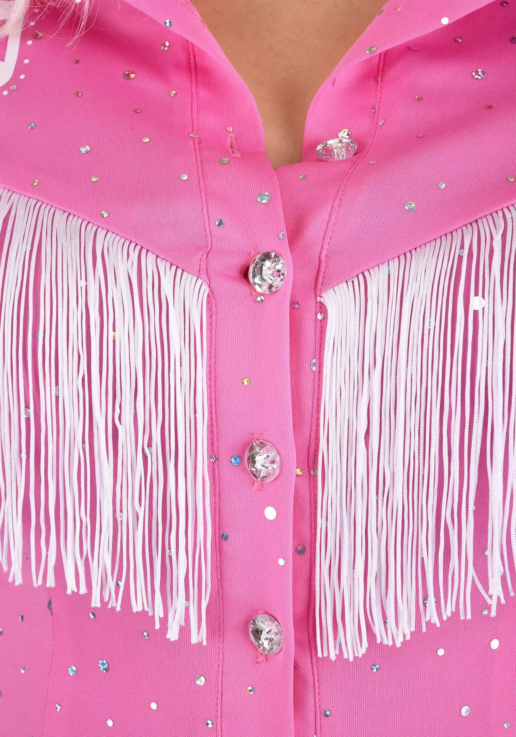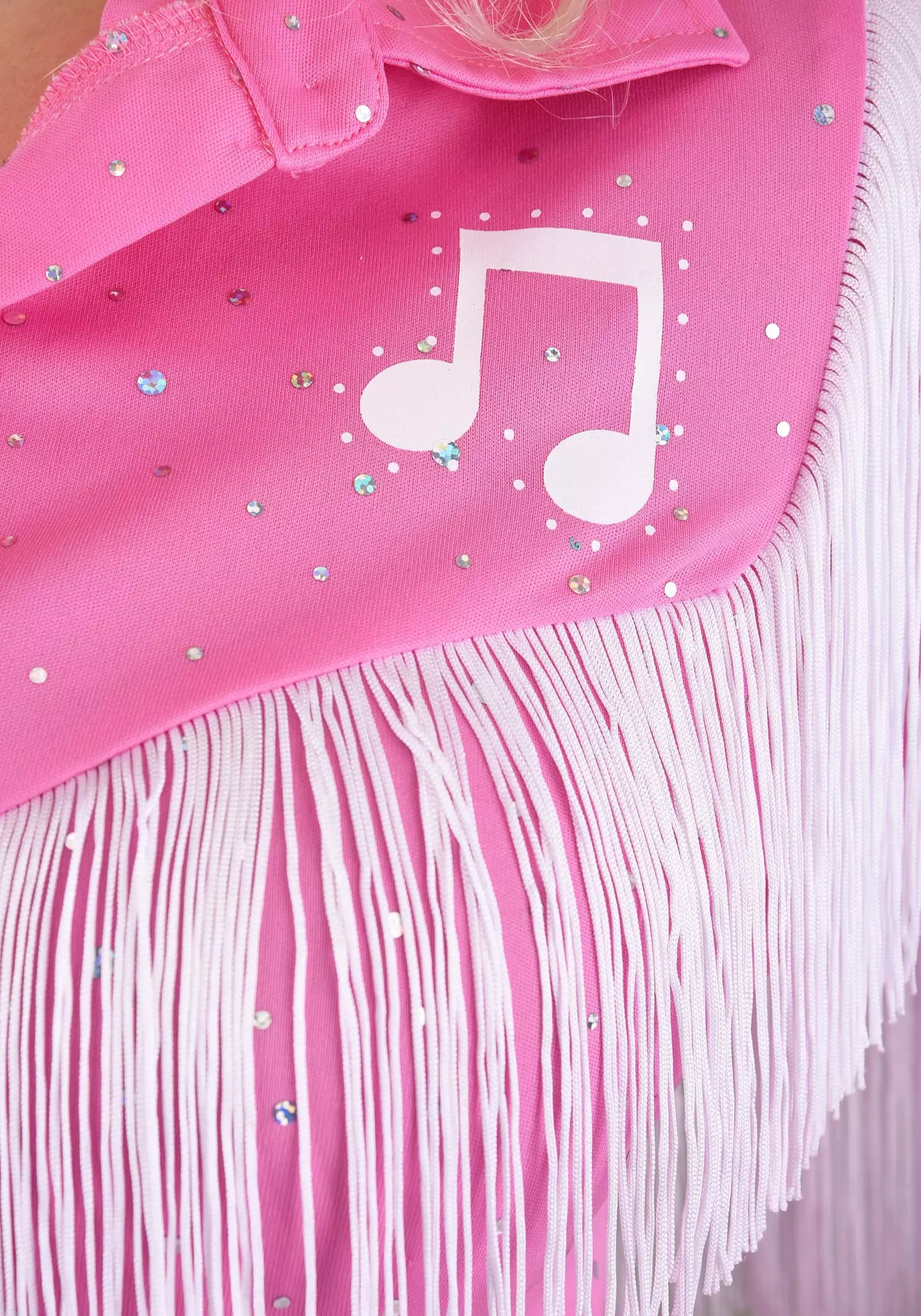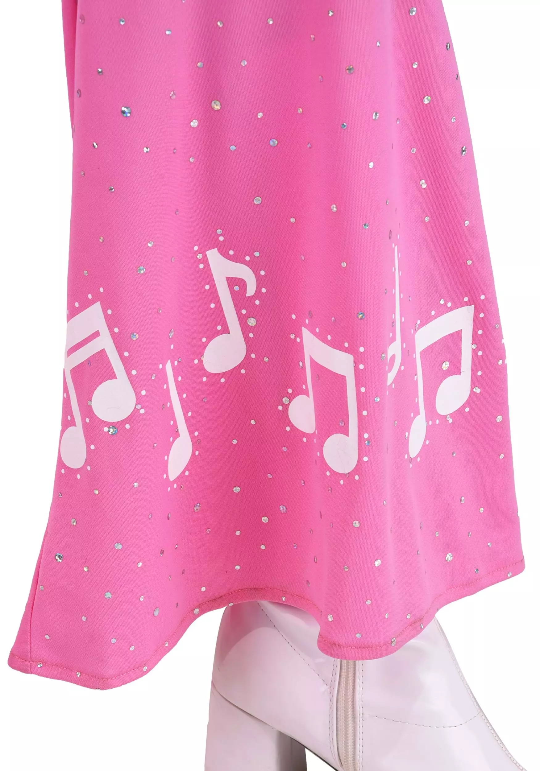 Our in-house design studio took every care to create a costume that sings to your every sensibility and fabulous flair. It’s a pink one-piece jumpsuit that hugs your curves and dazzles in all the right ways. The long-sleeved, bell-bottom silhouette gets a cowgirl kick from a cute collar, rhinestone buttons, and all-over sparkle. White fringe and music notes add that extra oomph you’ve been looking for. Add cowboy boots and a microphone, and don’t forget to tease that hair BIG (or grab a wig).