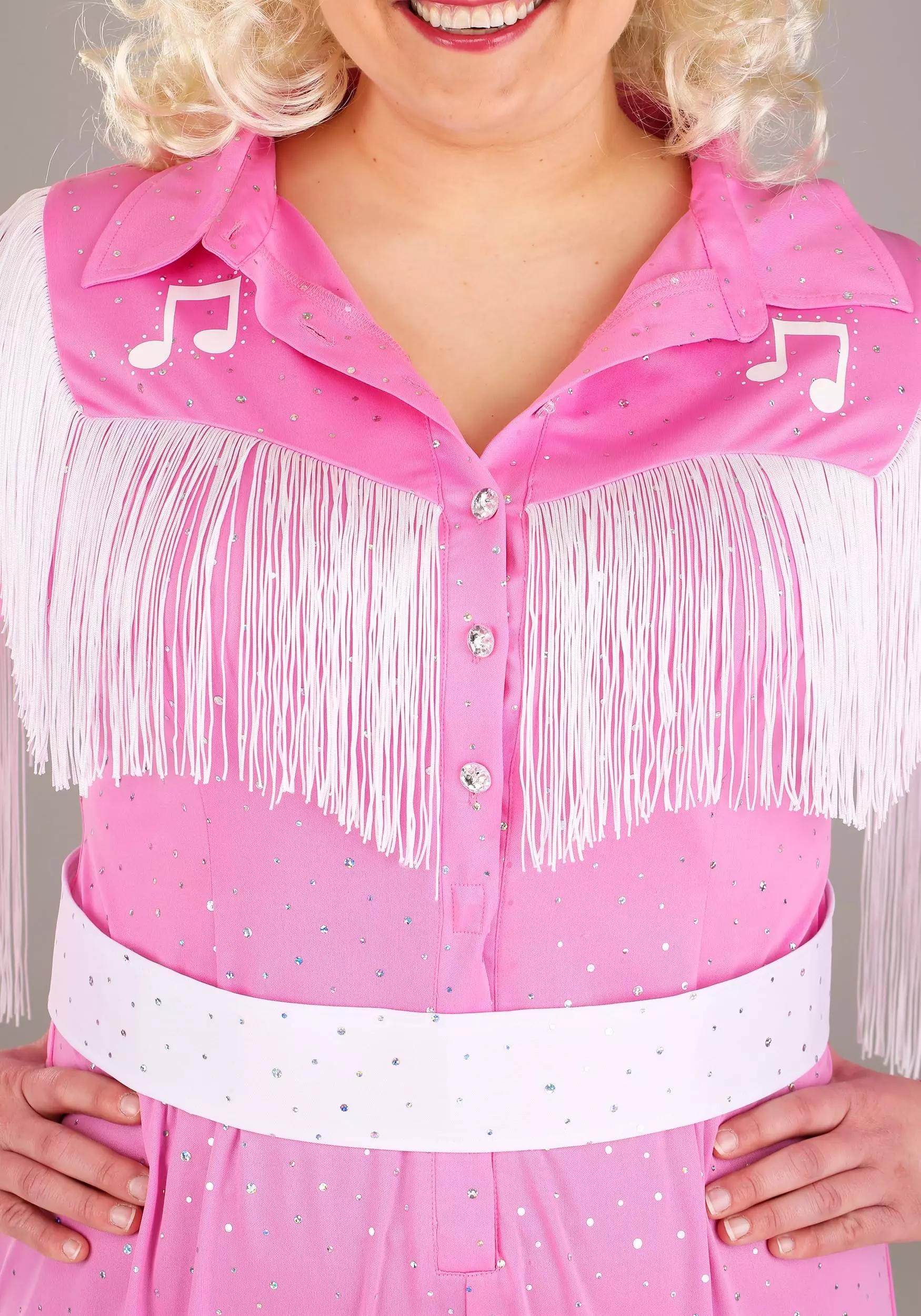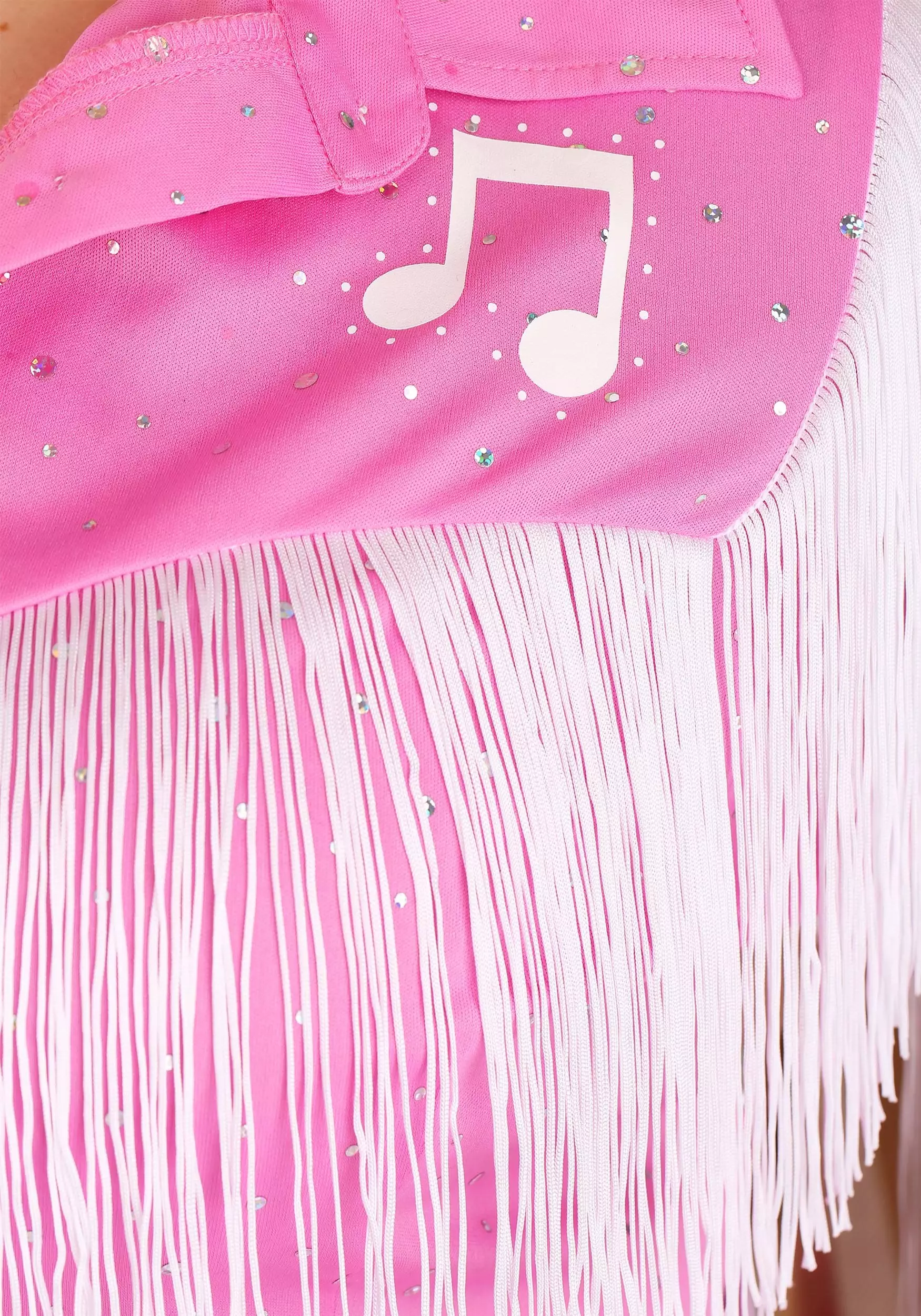 Step into the spotlight in your exclusive Country Singer Costume! You’ll be belting out the hits like the total babe you are in your one-of-a-kind bubblegum-pink button-up jumpsuit. The button-up style front has a sassy stretch of fringe across the chest and back that’s perfect for shimmying to the beat! White musical notes sashay up and down the jumpsuit’s front and sleeves and dance across the suit’s bell-bottom-style hems. The whole look cinches together with a show-stealing white belt. Add a glittering microphone and some fancy, fabulous cowboy boots and you’ll have an outfit guaranteed to bring the house down!