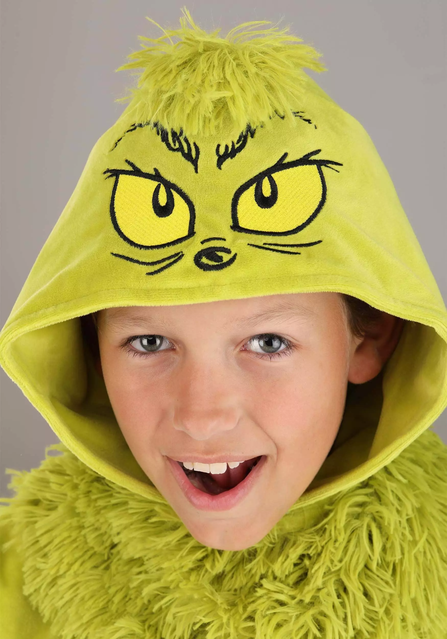 Bring Christmas cheer to everyone who sees you in this officially licensed, exclusive The Grinch Jumpsuit Costume for Kids! The jumpsuit zips up the front and is made of soft polyester plush the same shade as the Grinch’s fur in the classic Dr. Seuss story. Rib knit cuffs and green faux fur trim the wrists and ankles to keep you extra cozy. The attached hood is printed with the Grinch’s eyes, eyebrows, and nose, and decorated with a tuft of faux fur. The included faux fur collar ties around the back of your neck.