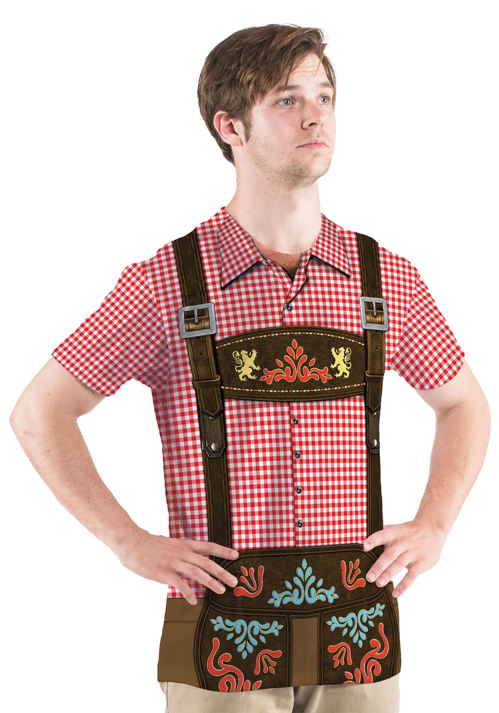 Next time you’re convincing people to join you for a weekend of polka, pretzels, and pilsners rock this lederhosen t-shirt. It has all the comfort you would want while also rocking a printed traditional checked collared shirt layered under realistic looking lederhosen straps. No need to sweat in leather pants when you’ve got a convenient option like this one on hand!