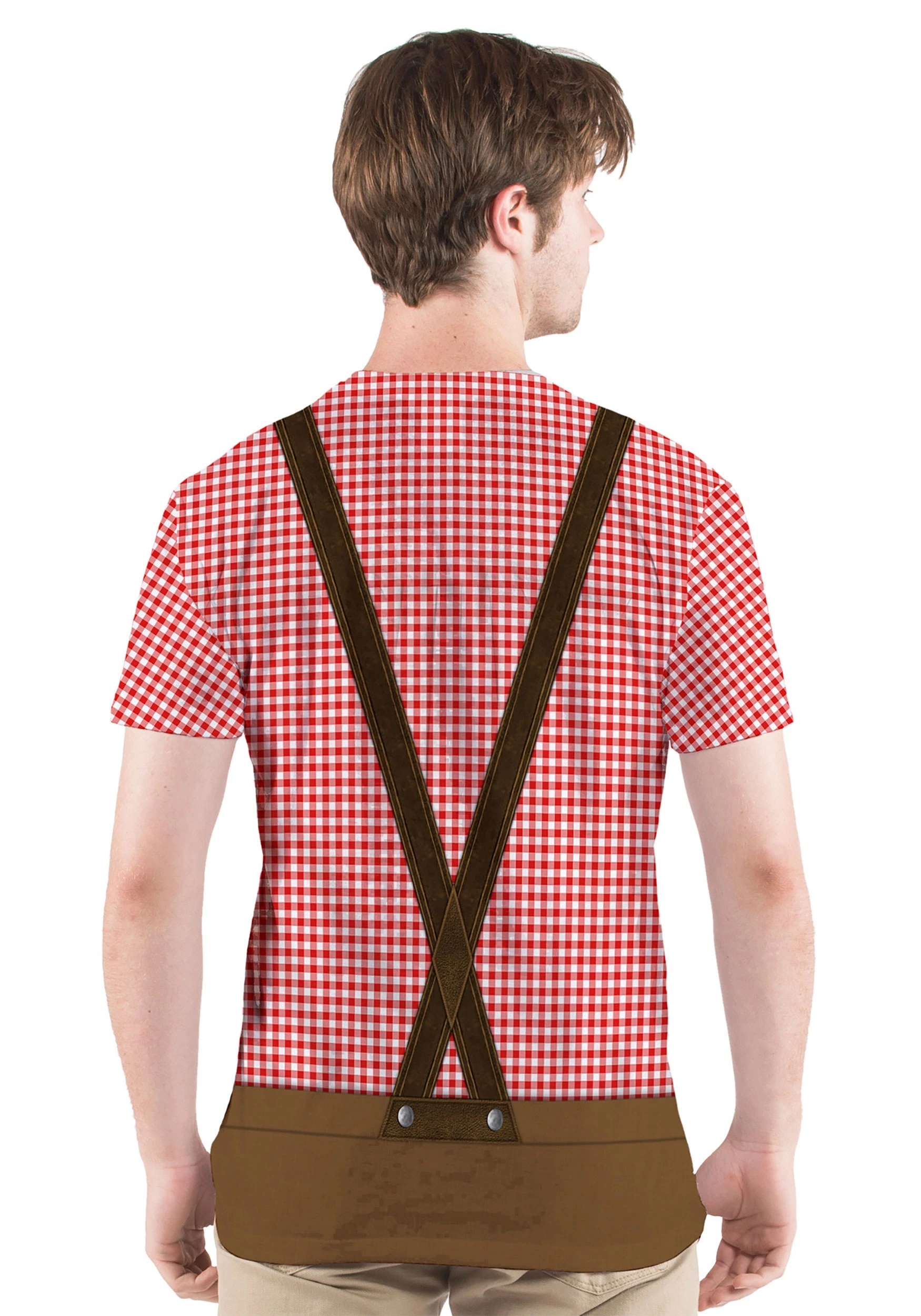 - All-over sublimated print of a lederhosen w/ gingham shirt