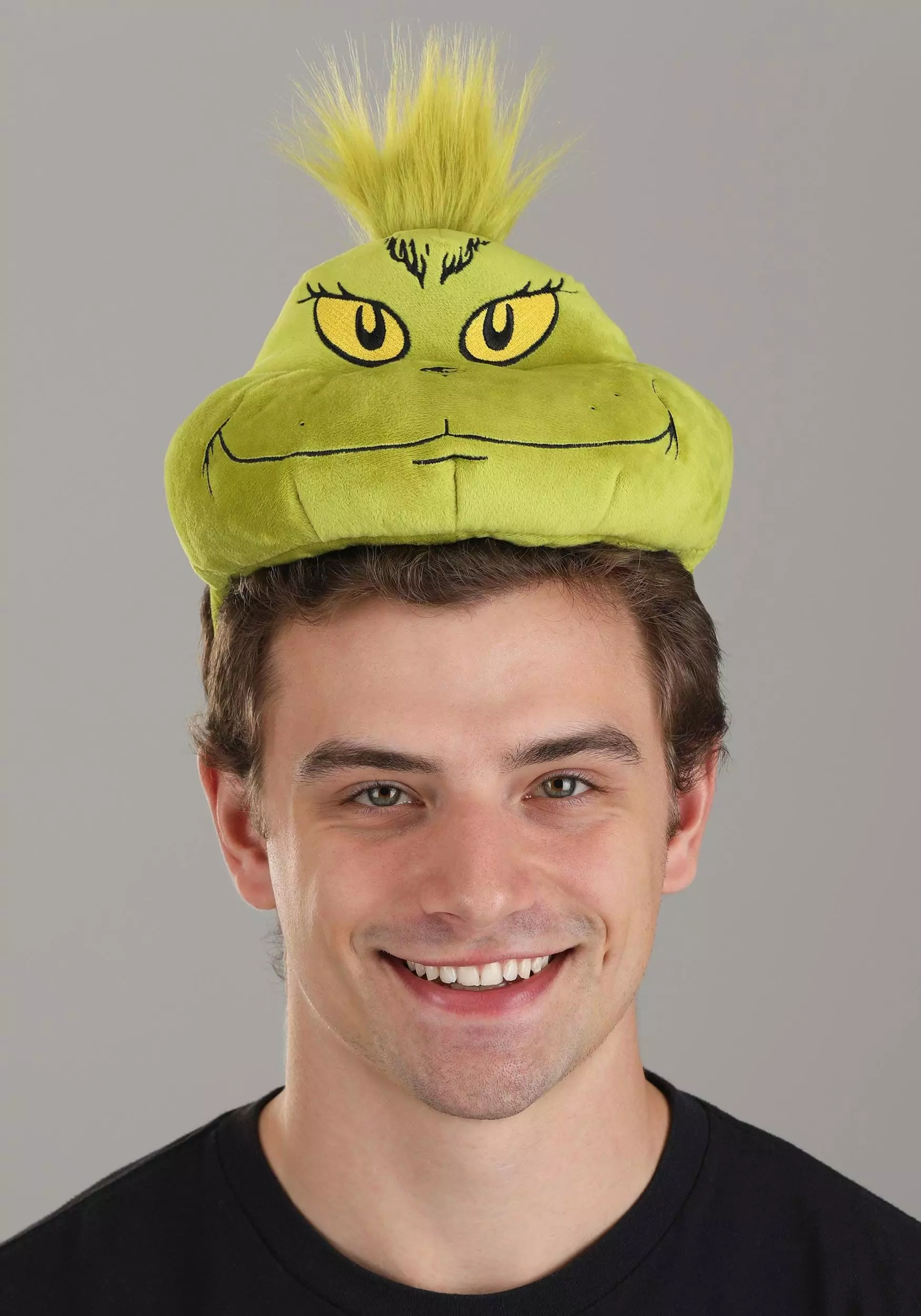 Celebrate the true meaning of Christmas by wearing your officially licensed The Grinch Face Costume Headband! The sturdy accessory is covered with green fabric and topped with a stuffed Grinch face made out of green faux suede. It’s printed with the yellow eyes and smirky grin of Dr. Seuss’s beloved baddie and topped with a tuft of green faux fur.