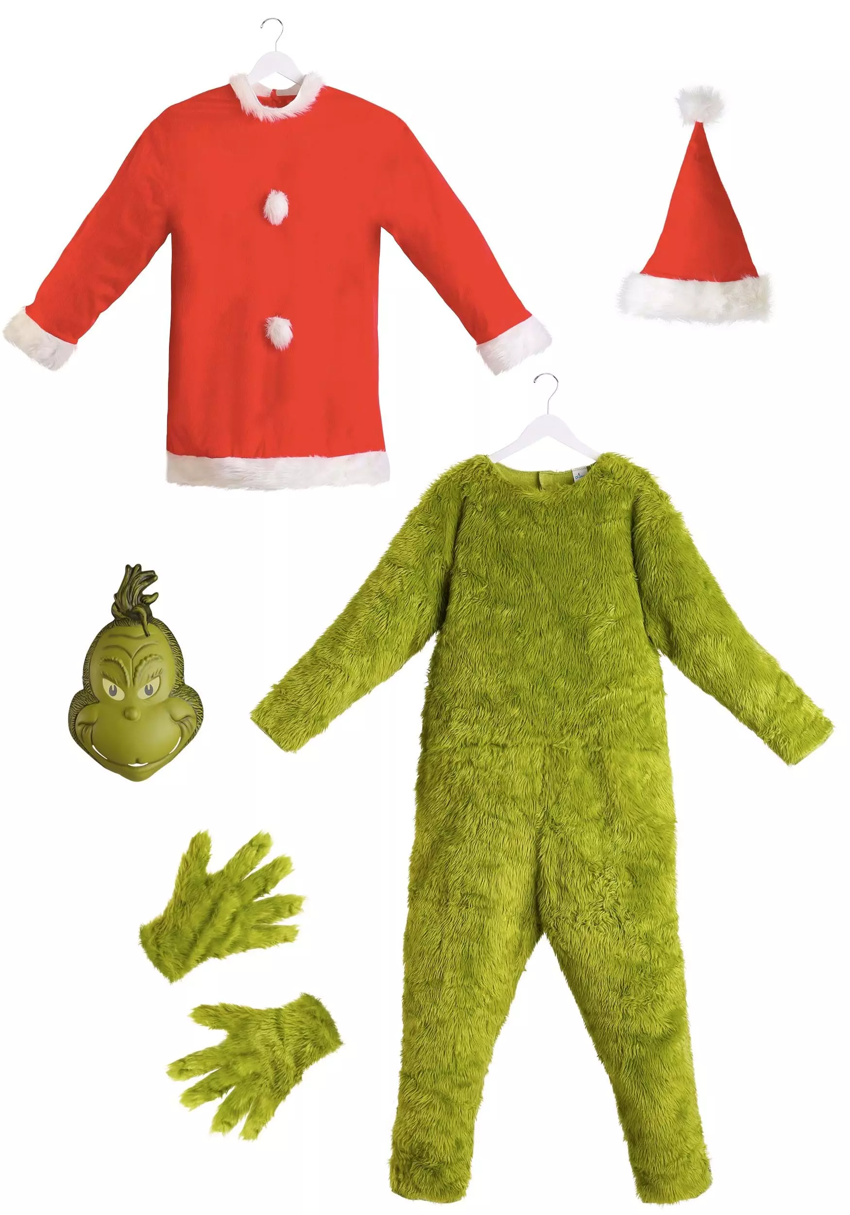 This is a deluxe costume that comes with everything needed for your all-green transformation. The fur jumpsuit fastens together with a simple hook and loop fastener while the Santa suit tunic, featuring furry pom-poms and furry cuffs, fits easily over it. The included gloves are covered in the same green fur as the jumpsuit so you look green and fuzzy from head to toe. Finally, the character mask and Santa hat complete the costume. The molded plastic mask has an elastic band able to comfortably stretch around all head sizes.