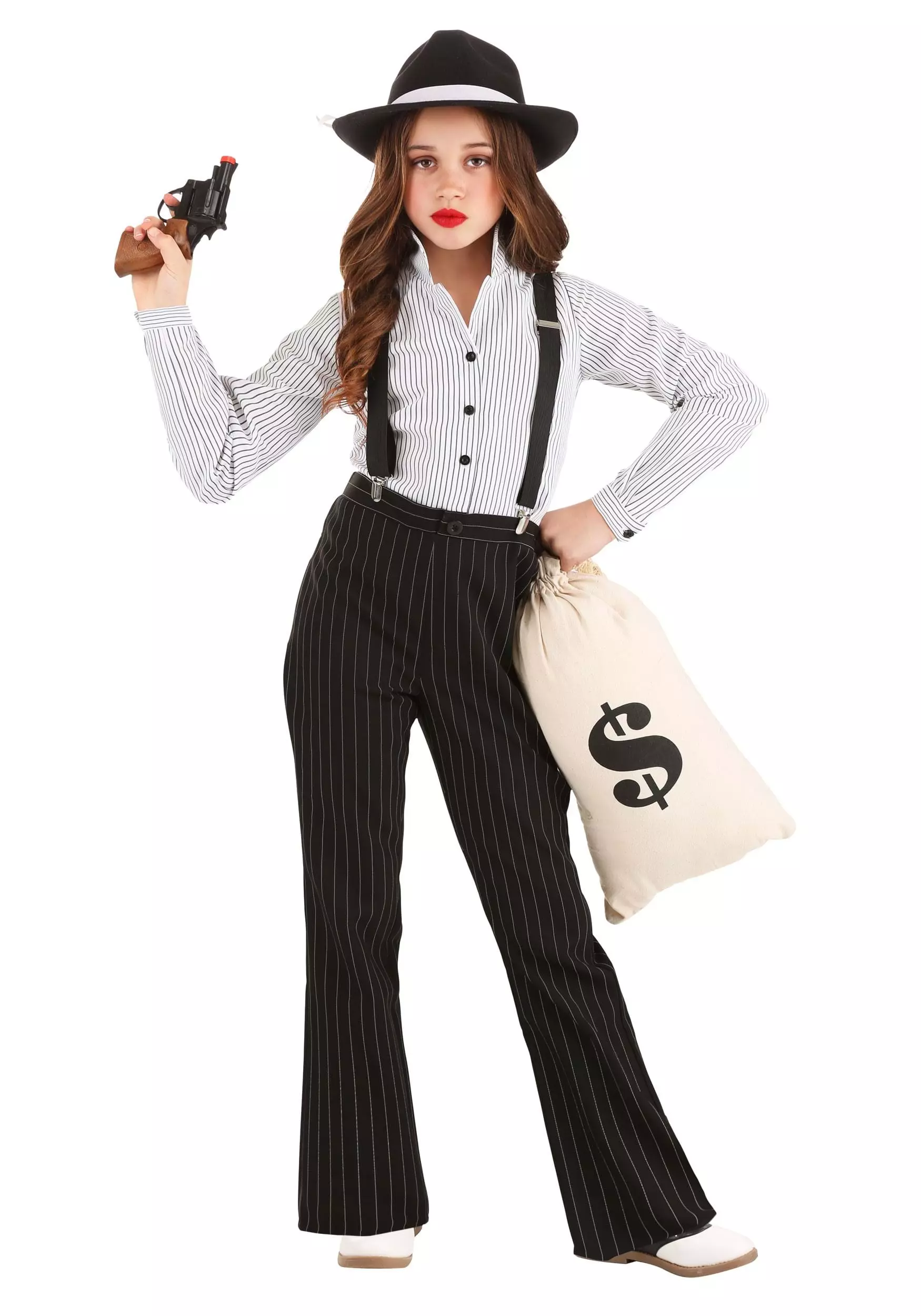 She’s tough as nails and she’s going to get all of the dough this Halloween! You’ll love playing the part of an old-time crook in this exclusive 1920s Gangster Lady Costume for Girls. Pilfer the loot and look great doing it in a white button-down pinstripe shirt with a poppable collar and snazzy cuffs. It goes perfectly with the matching black pinstripe pants. The legs has a slight flare to them that would make Al Capone weep with style envy. Hold them up with the pair of suspenders and you’ll be the last word in criminal couture!