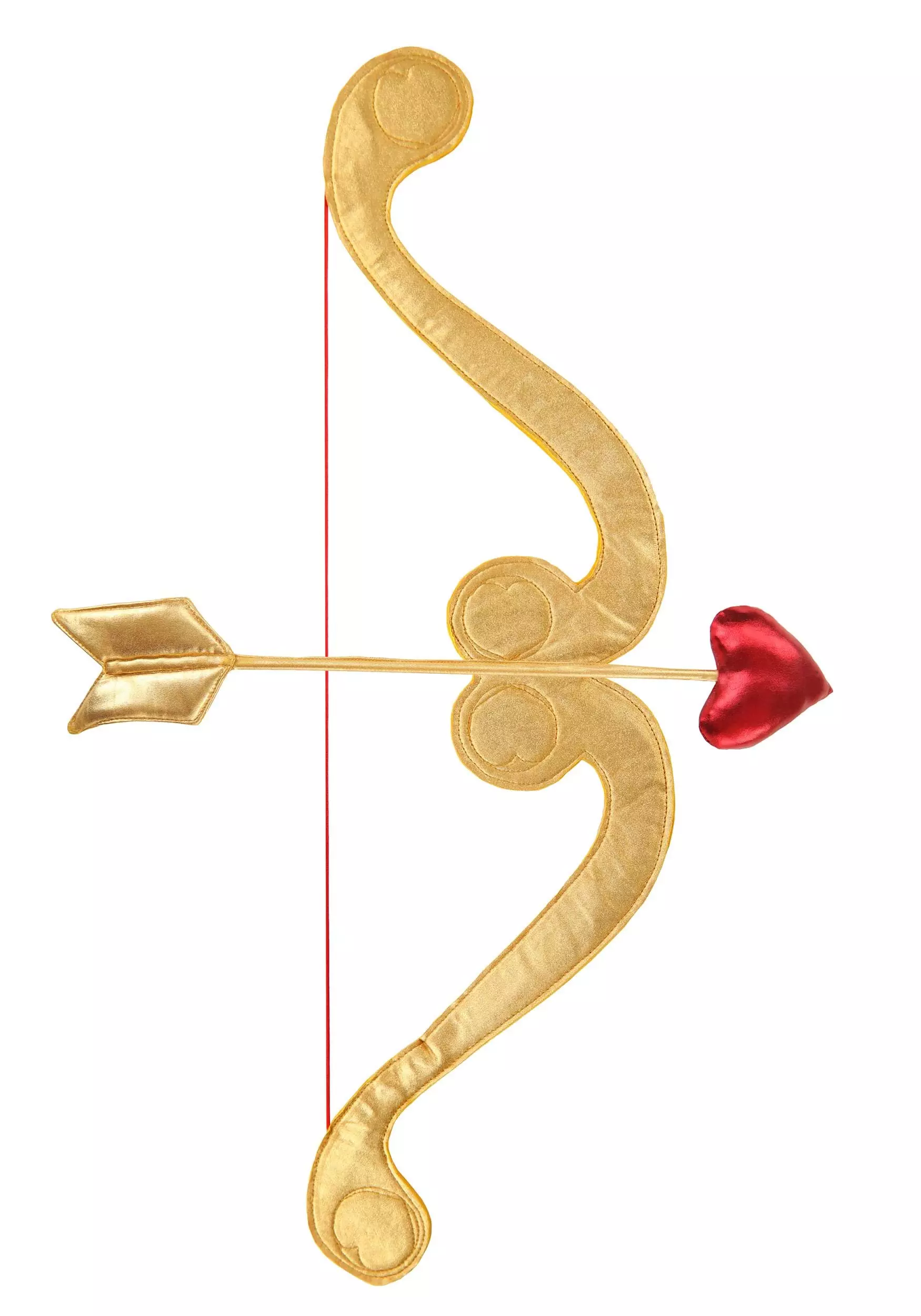 Spread the love when you use this Cupid Bow and Arrow Accessory! The exclusive bow prop is made of a wire frame hidden beneath layers of foam-backed metallic gold polyester. A bright red string is strung from both ends. It comes with an arrow made of a plastic rod encased in gold fabric and tipped with a stuffed red heart “arrowhead.”