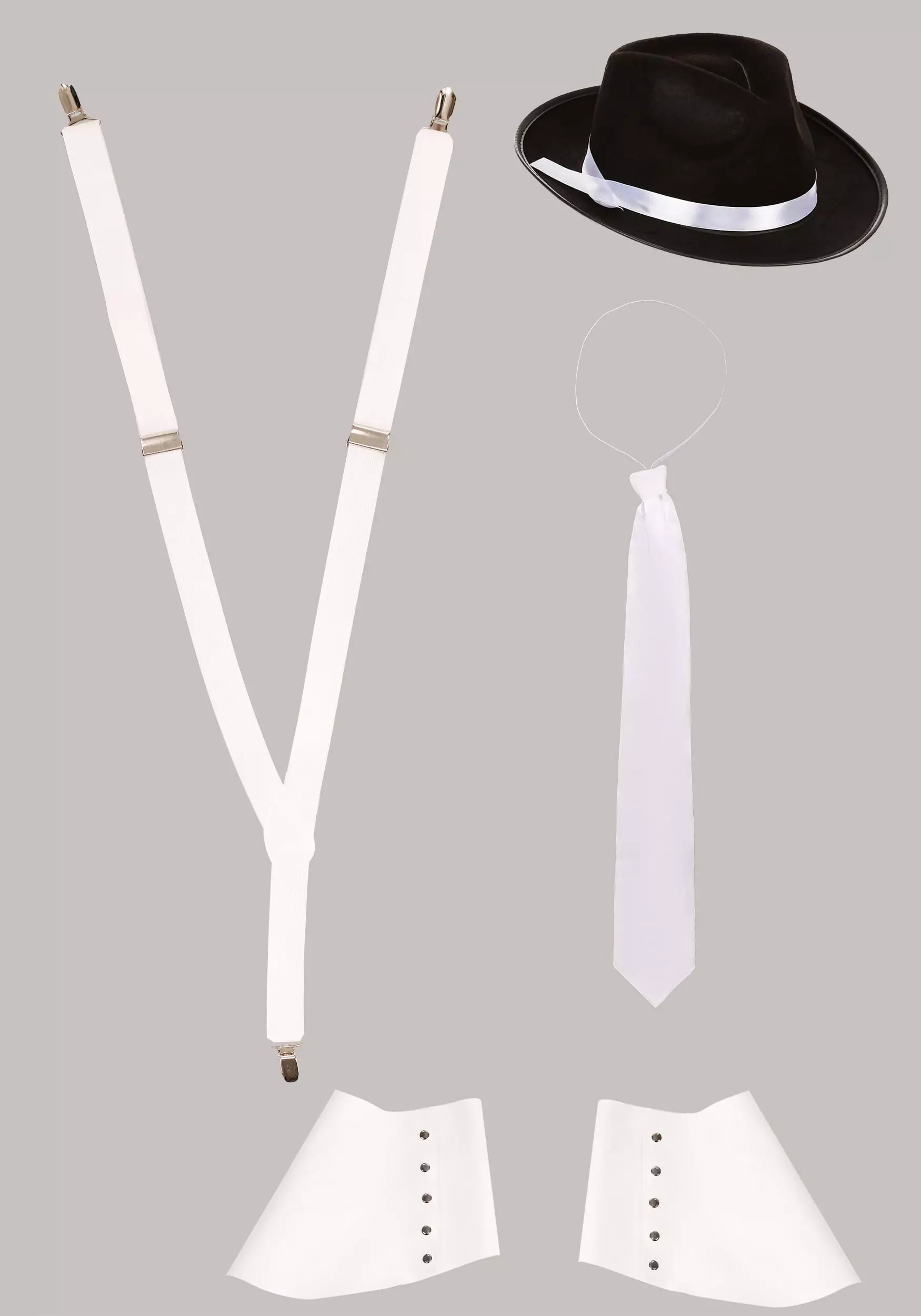 Don’t wait to be invited to join the family. Become the Don of your city with ease thanks to this Made by Us collection of Gangster Accessories. The 1920s hat features a black, satin ribbon that contrasts with style with the pair of white suspenders, the satin tie, and a pair of PVC vinyl spats to wear over your shoes.