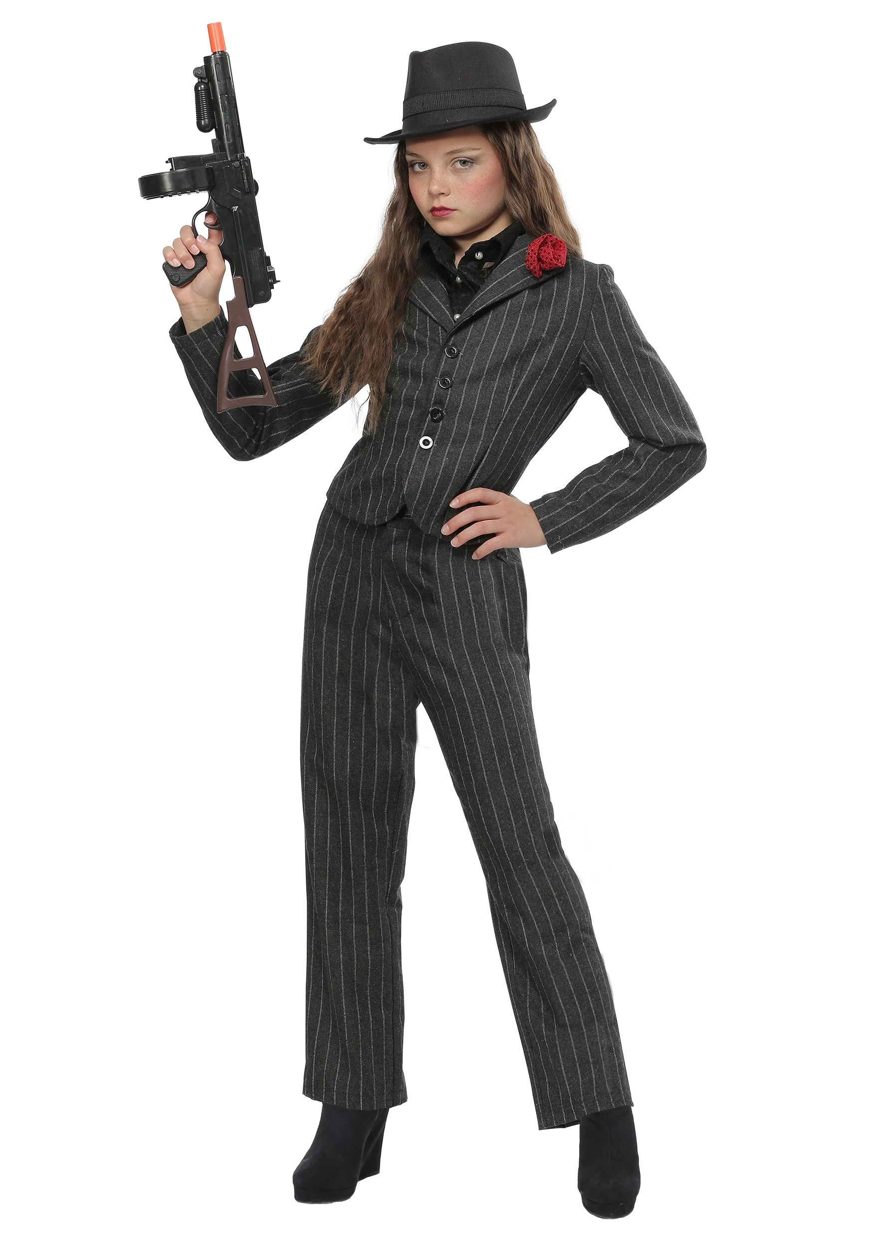 So, when she asked you to be a gangster for her next costume party, how could you say no when it seemed so right! This ensemble is chic as well as intimidating. The pinstriped blazer and pants will make her look professional as she’s bootlegging banned soda pop into the school cafeteria. Someone this professional looking isn’t about to end up in the Big House (detention), she’ll be on the lam before those nasty coppers (teachers) catch her! With a black, collared Dickey and a red rose, she won’t have any problem collecting dough and keeping those fellow gangsters on the up and up.
