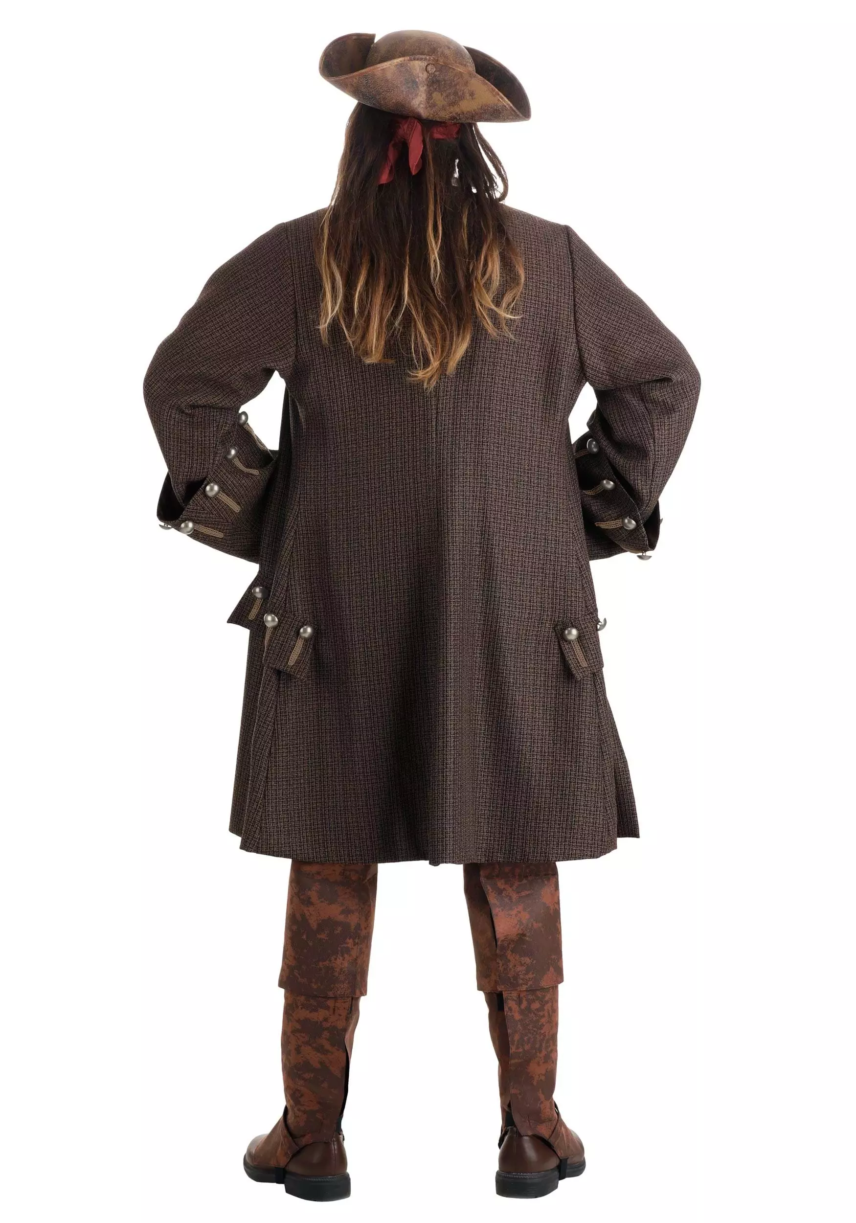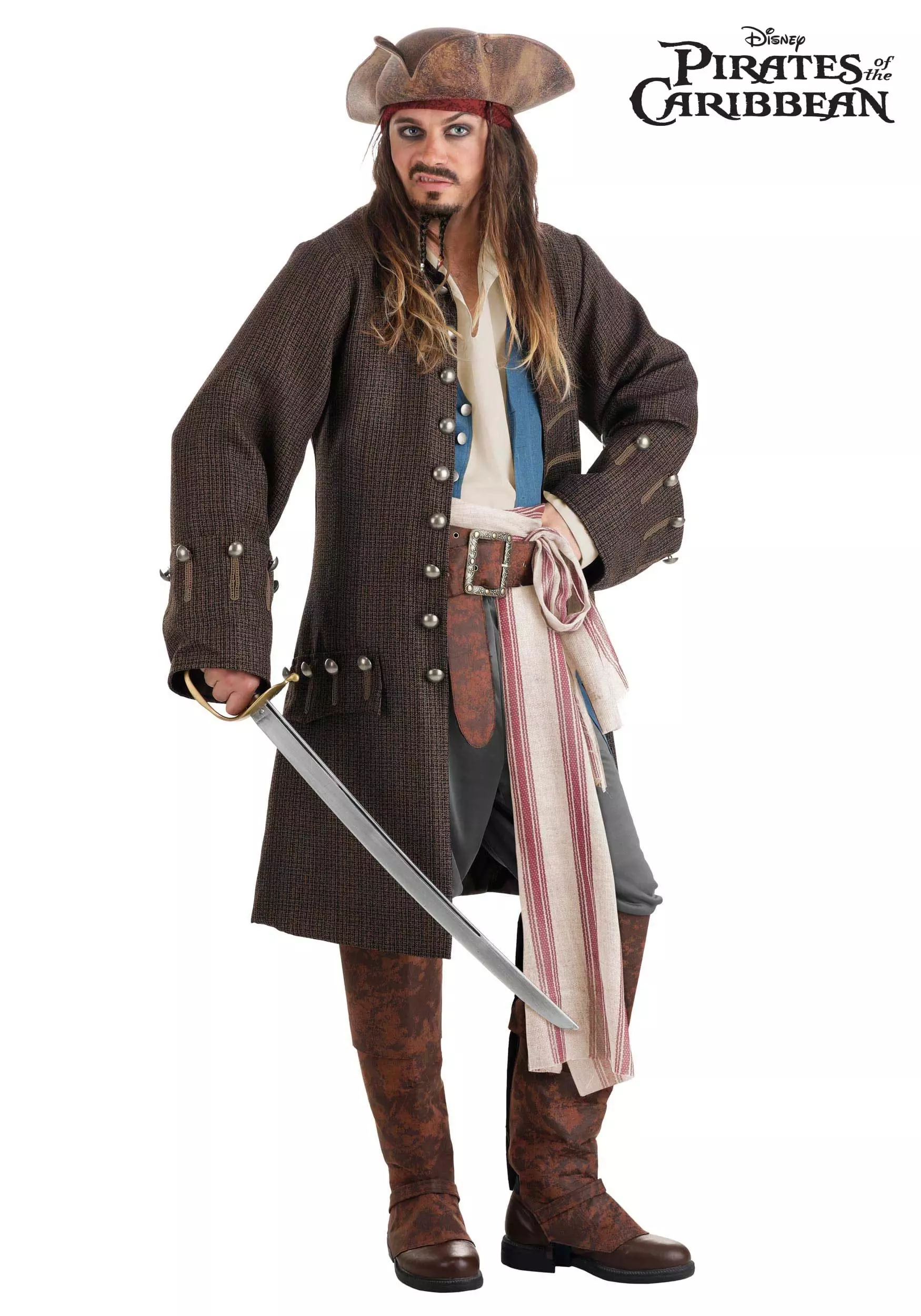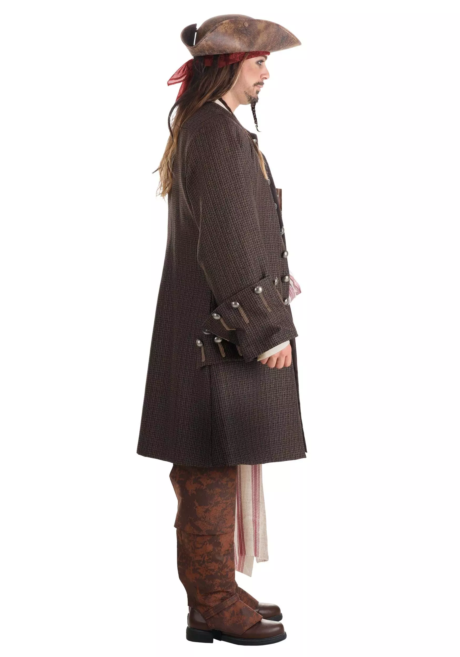This Adult Deluxe Disney Jack Sparrow Pirate Costume comes with all of the pieces you need to become the legendary pirate. The costume begins with a shirt with an attached vest. The coat is designed to look like the one worn by Jack in the movies and fits over the shirt to give you an authentic pirate style. The belt and fabric sash fit around the waist. The boot tops fit over most pairs of shoes, so you can wear them with your most comfortable pair of boots. The costume also comes with a red headscarf and a pirate hat to help you feel like a true captain. The only thing missing from this costume is your own pirate ship to sail you to new adventures!
