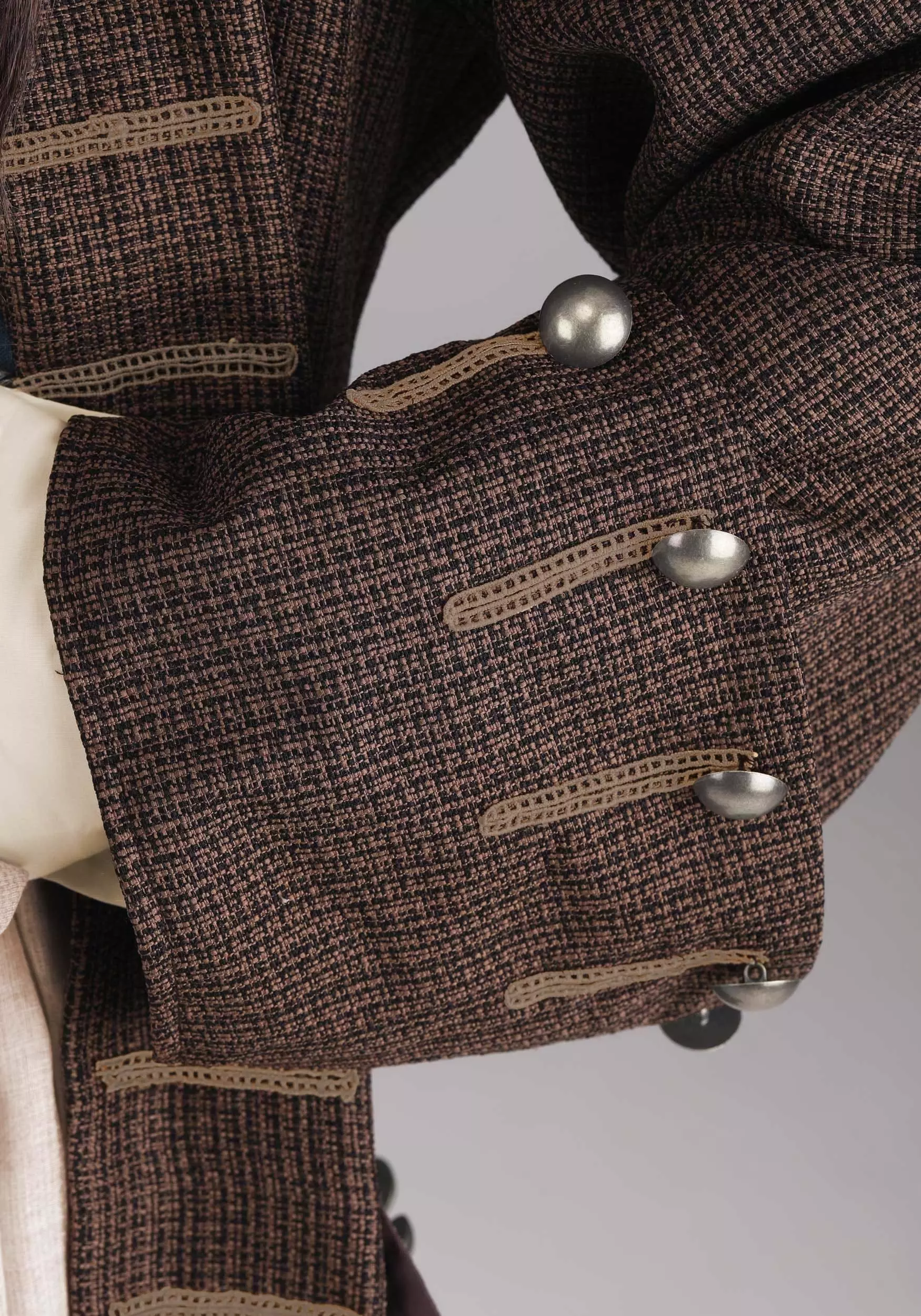 - Heathered woven brown jacket w/ fabric lining has antique silver dome button closure down center front
