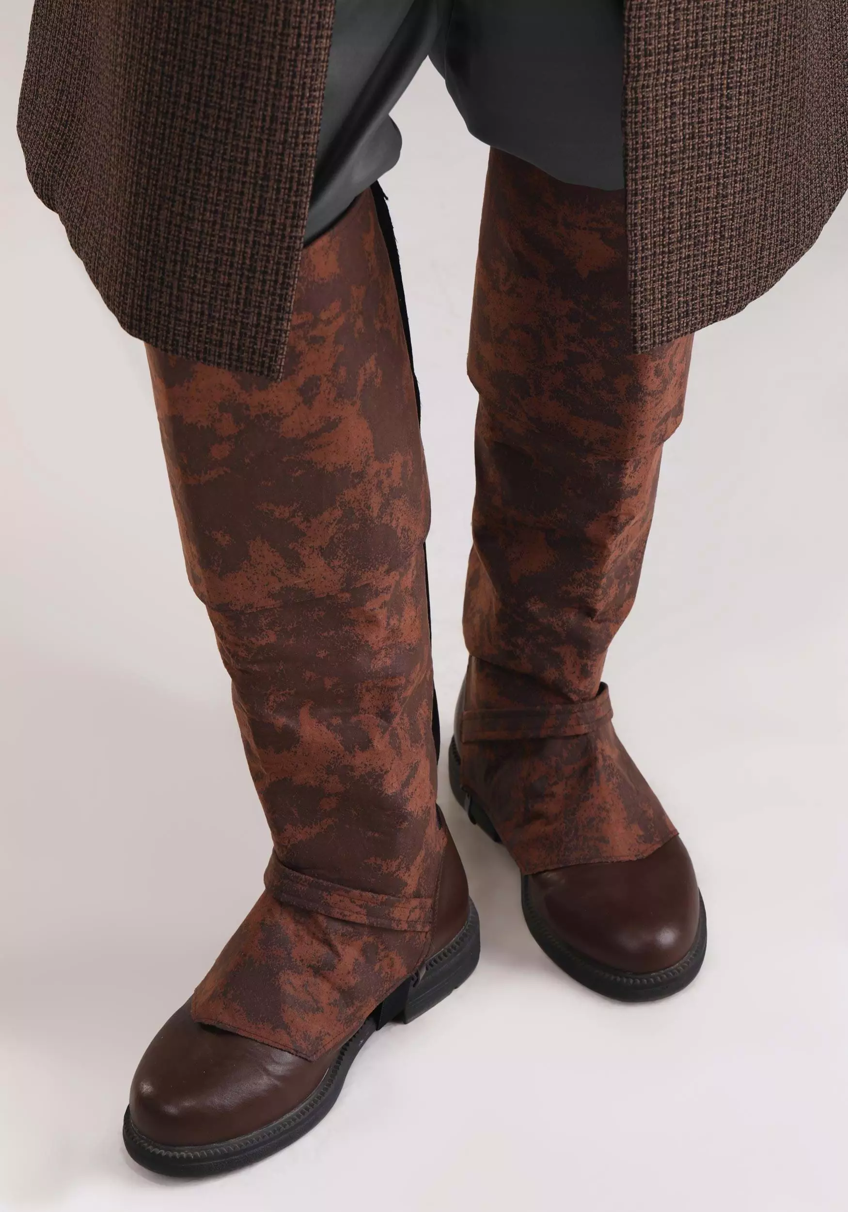 - Pair of boot tops have slide on and have elastic bands to secure on your legs and under your feet
