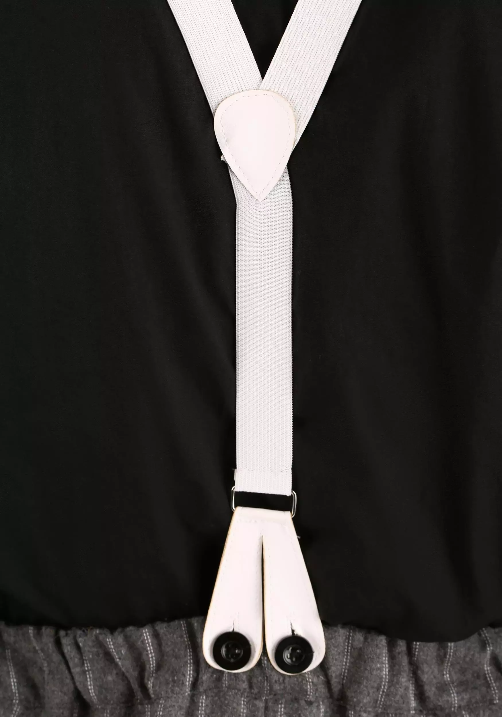 - Elastic suspenders attach to pants with buttons on waistband