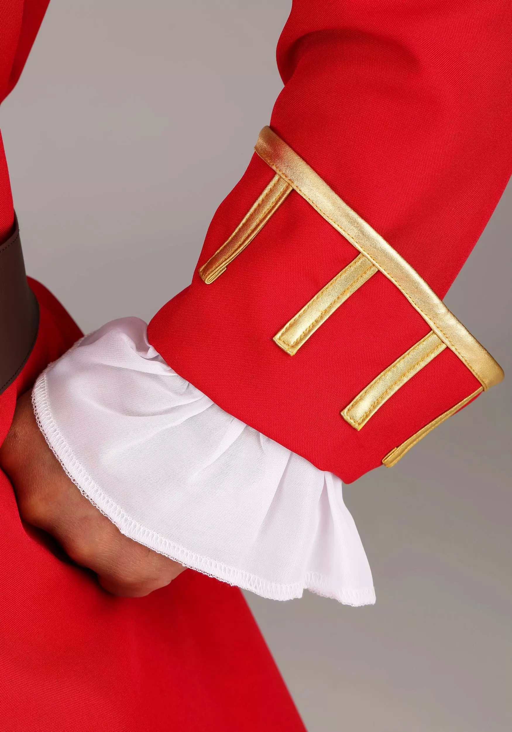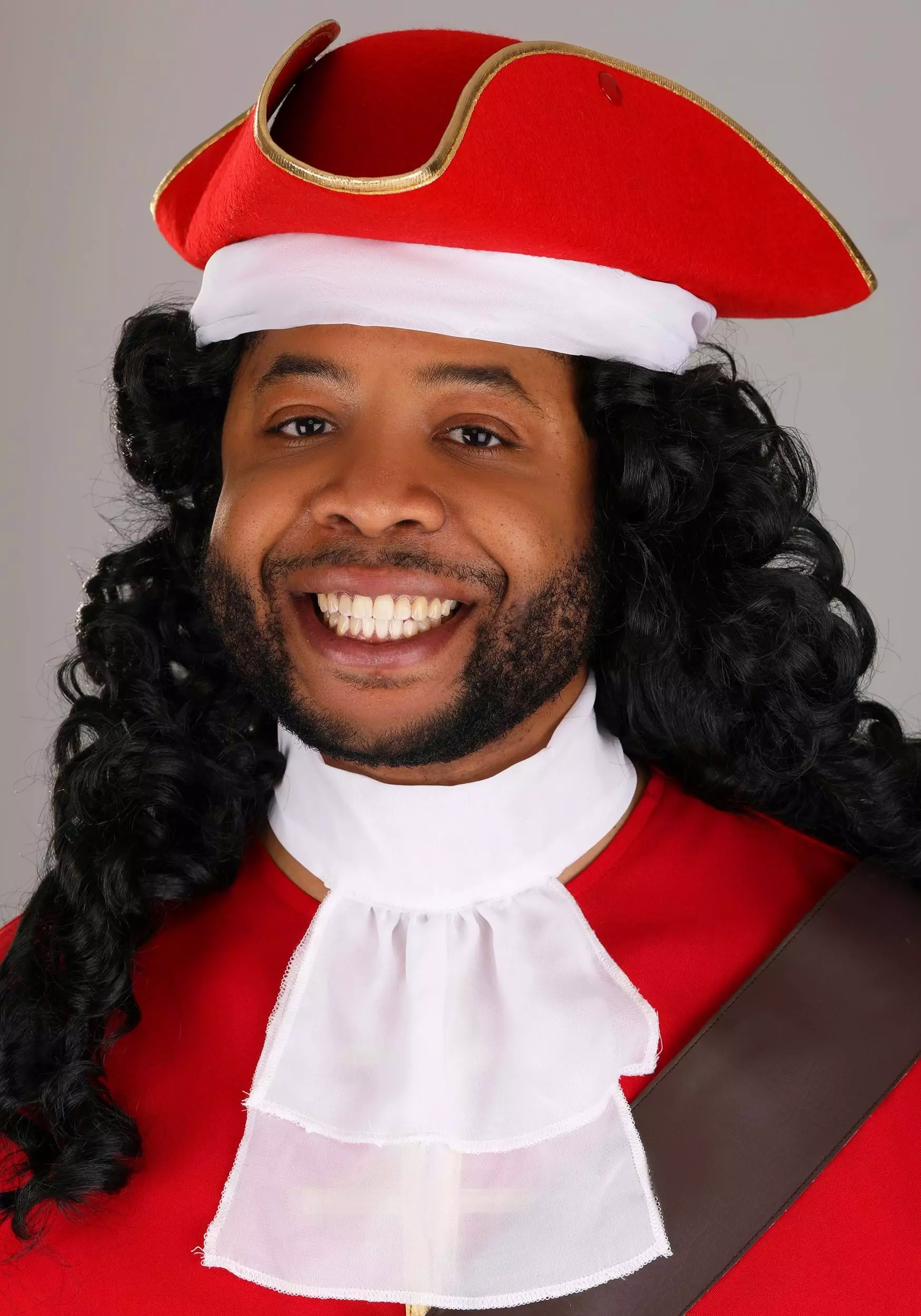 Set sail for fun when you wear your exclusive Plus Size Rum Captain Costume for Men! The costume’s top fastens up the front and is made of red poplin. It’s designed to look like a seafarer’s jacket, complete with turned-up cuffs and metallic cold trim. The cuffs are sewn with white chiffon ruffles to match the ruffled jabot that secures around your neck. Two faux leather belts can be fastened around your torso. Tie the triangular chiffon scarf as desired and complete your dashing appearance with the brown foam-backed tricorn hat!