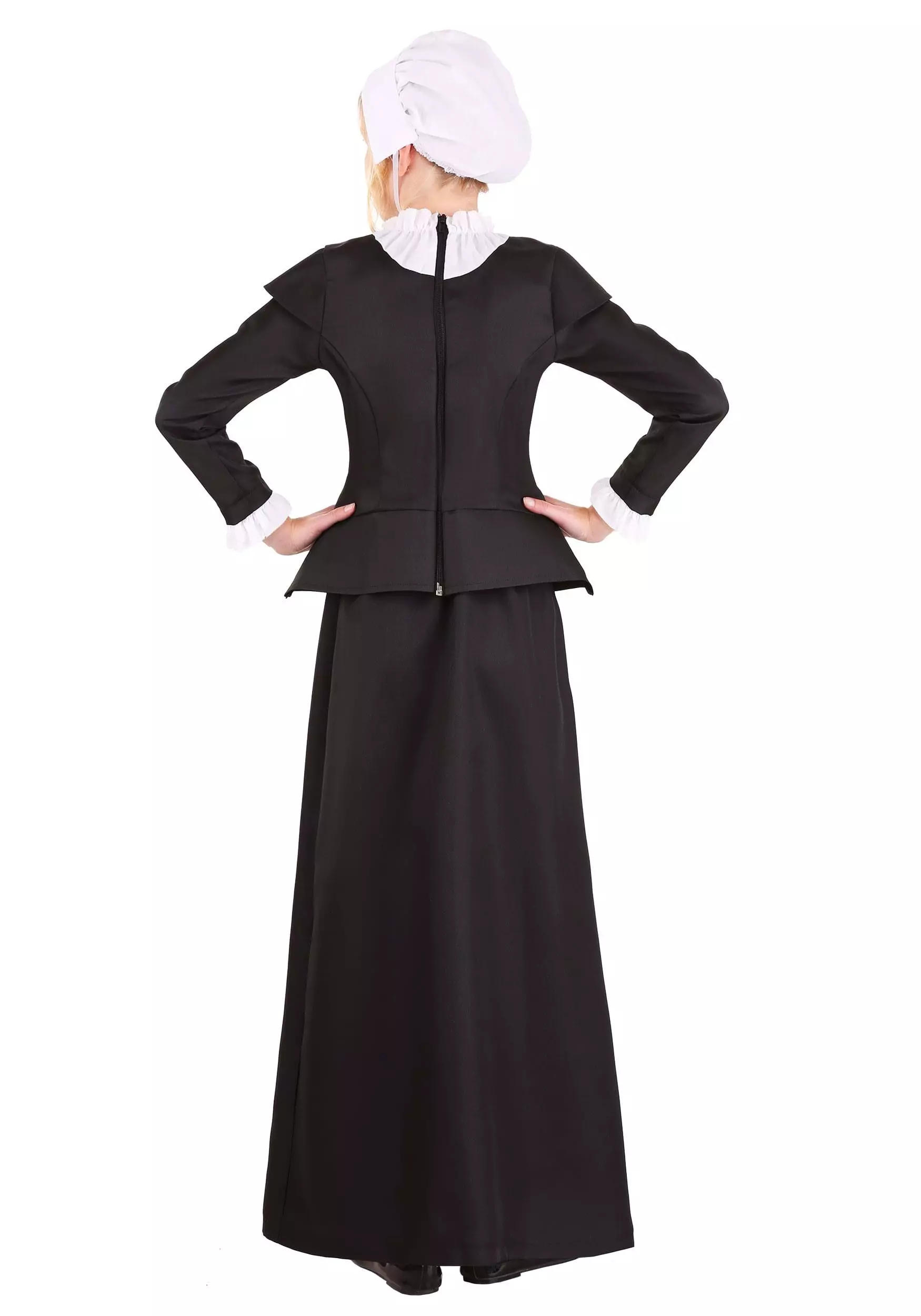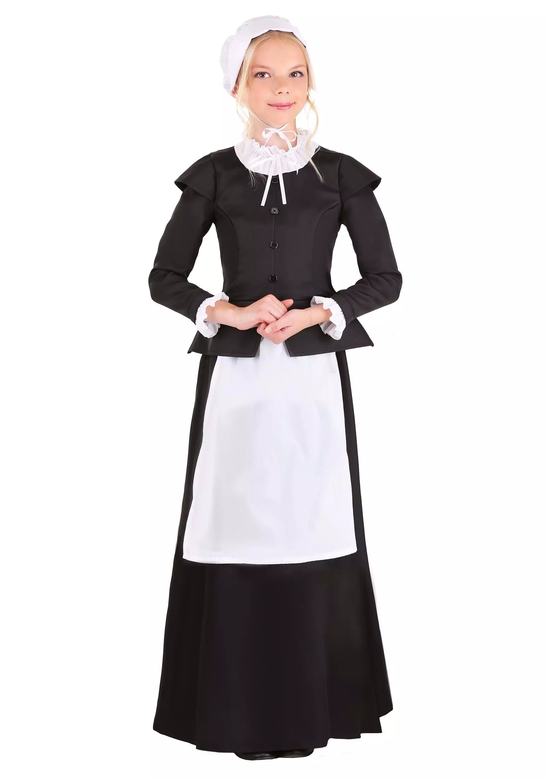 This Thankful Pilgrim Costume for Girls will make your child look like she’s coming straight from the history books. The top zips up the back and has wide shoulder detail and a ruched white neckline. The shirt lays over the skirt with a peplum. Floor-length and straight cut, this skirt is layered under a white apron and will make for a striking look for Thanksgiving festivities and family get-togethers.