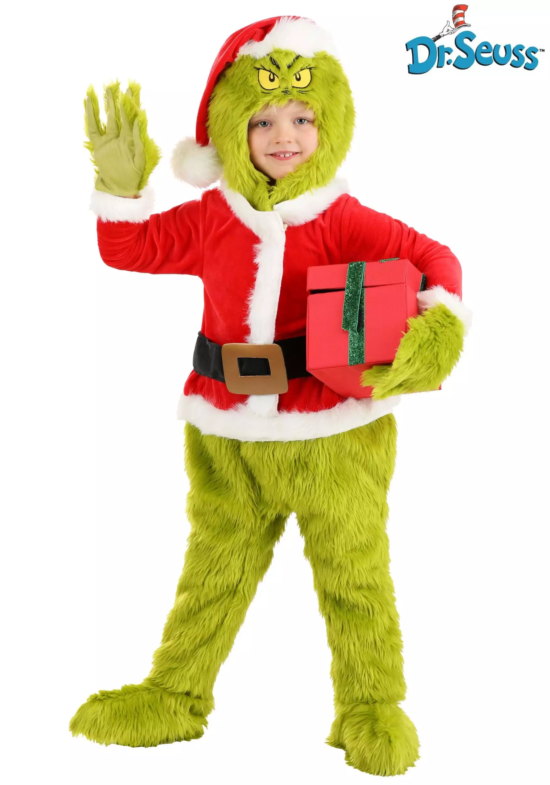 Go from hating Christmas to being a huge Christmas fan when you wear your exclusive, officially licensed Santa Claus Costume for Toddlers! The jumpsuit fastens up the front to make it easy to wear. Its torso and arms are made of red velour and trimmed with white faux fur just like the Grinch’s santa suit. The legs are made of green faux fur to match the included mitts and shoe covers. The attached hood is embroidered with Grinch facial features and sewn with a red Santa hat trimmed in white faux fur.