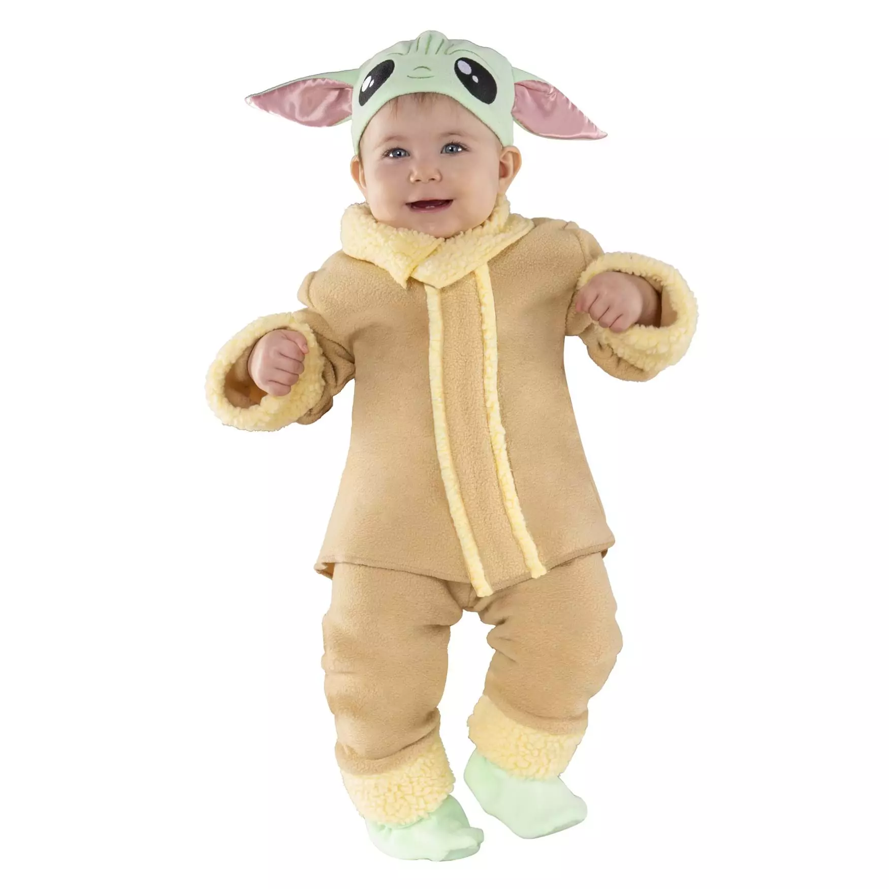 The tan jacket and pants that your child will be wearing will resemble the Younglings robe that Grogu wore. They are extra cozy and warm thanks to the sherpa collar and cuffs on the sleeves and pants legs. A cute pair of green booties are included with this costume. They are designed with anti-skid soles to help keep your little one safe.