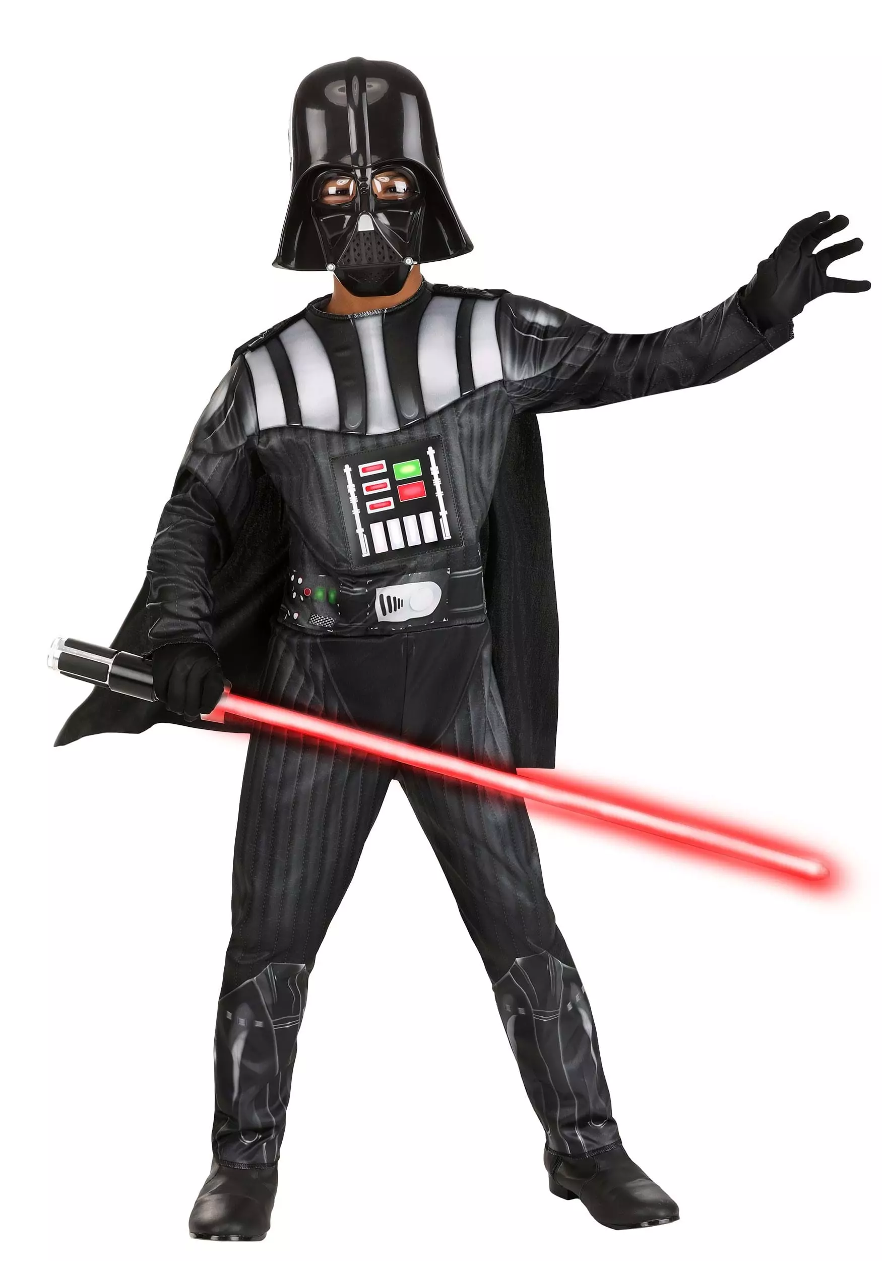 Transform into the most famous Sith Lord of all time by wearing your officially licensed Light Up Star Wars Darth Vader Costume for Kids! The one-piece outfit fastens up the back and is printed with thin black and dark gray stripes. Graphic designs on the chest include a shiny breastplate and a control panel with red, green and silver buttons. A utility belt fastens around the waist and a short cape is sewn to the shoulders. Add the plastic helmet to finish off your outfit. When activated, the costume lights up!