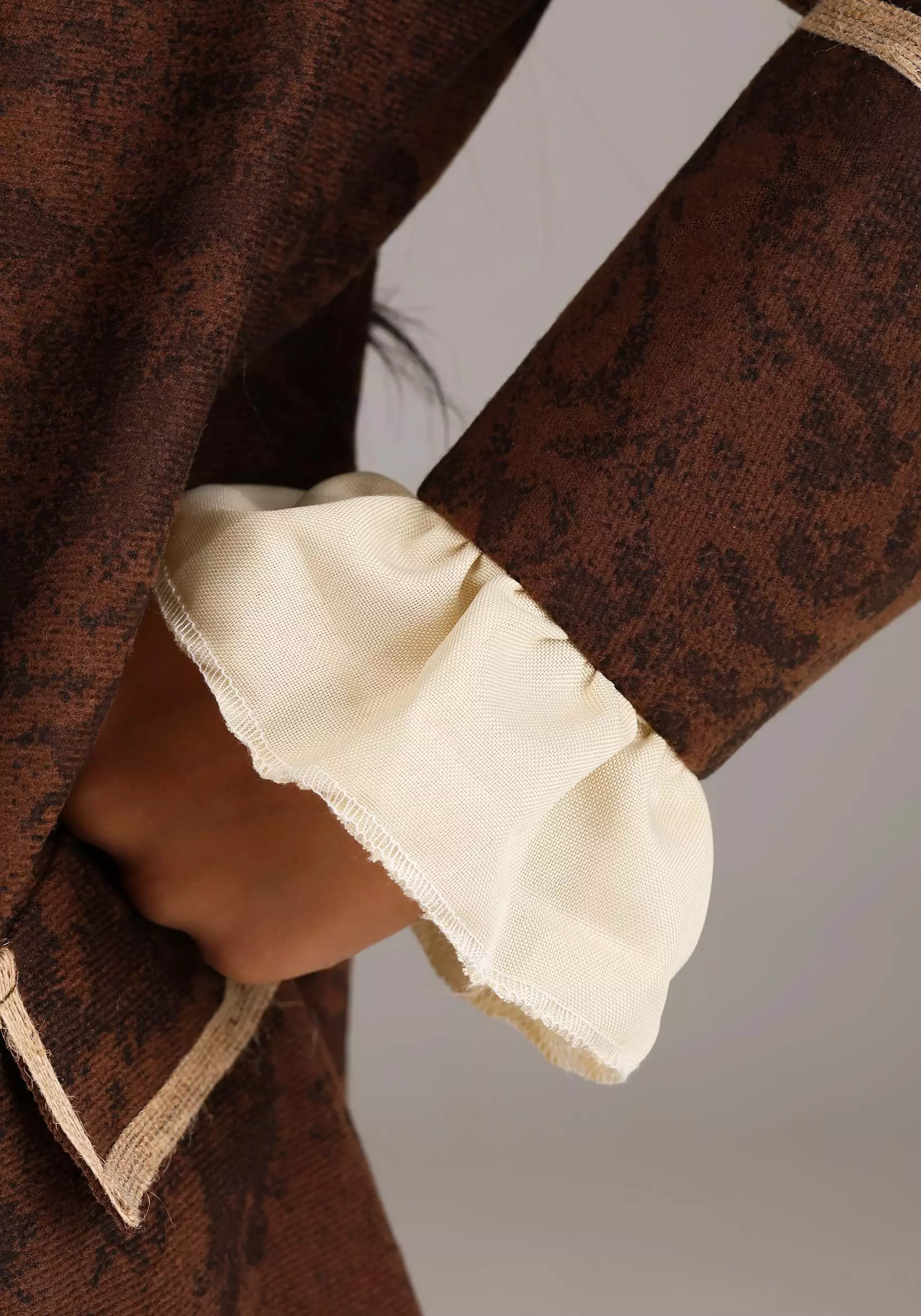 - Jacket has braid edging on notched lapels & collar, false pocket flaps, and sleeve cuffs