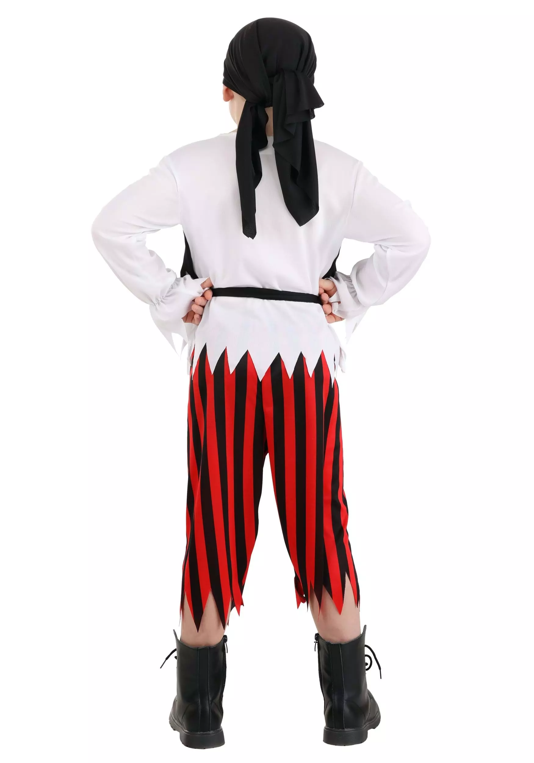 Live a rover’s life and dress in this exclusive Classic Pirate Costume for Kids! A white shirt with a jagged hemline and cuffs is just the thing to keep you cool in tropical waters. An attached black vest front is sewn with a skull and crossbones, and a black sash ties around your waist. Add the striped pants and tie the black bandanna around your head for good measure.
