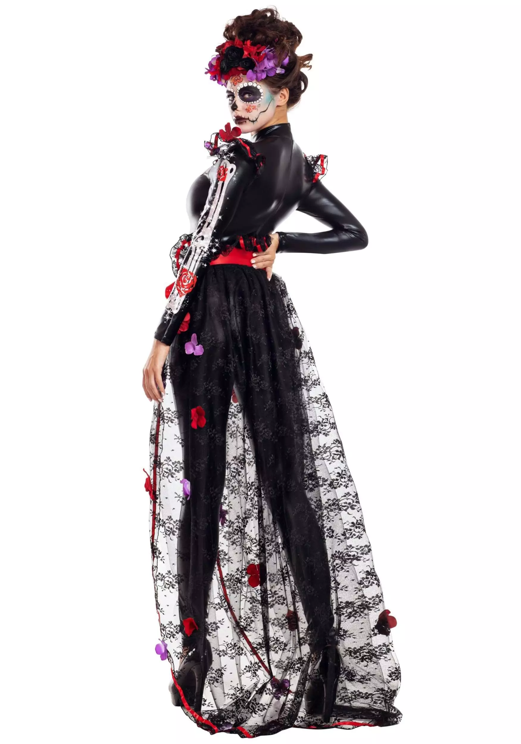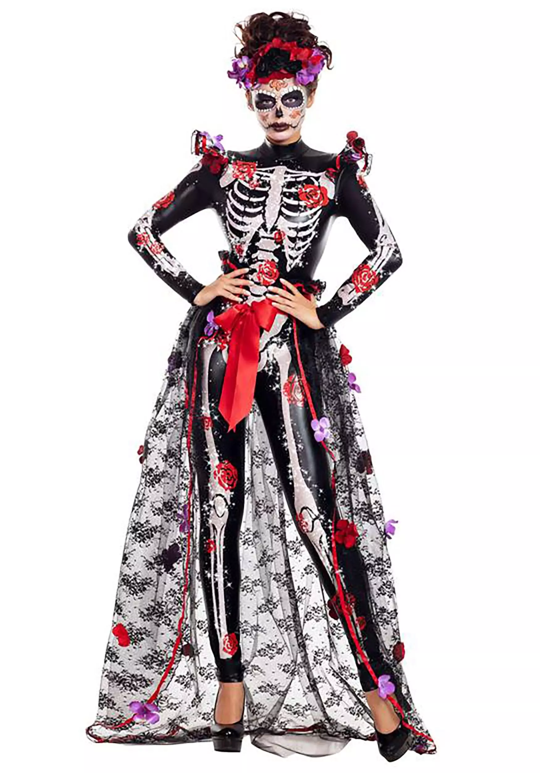 You’ll look wickedly lovely in this Rosas Day of the Dead Costume! The outfit includes a long jumpsuit made of fitted, shiny black fabric. The front is printed with graphics of a realistic-looking skeleton. Printed red roses and sparkly details overlay the bone graphics. Each shoulder is decked with ruffles made of black mesh, red ribbon, and flower details. A long, open-fronted skirt made of lacy material sewn with fabric flowers ties around your waist. The last touch is the floral headband!