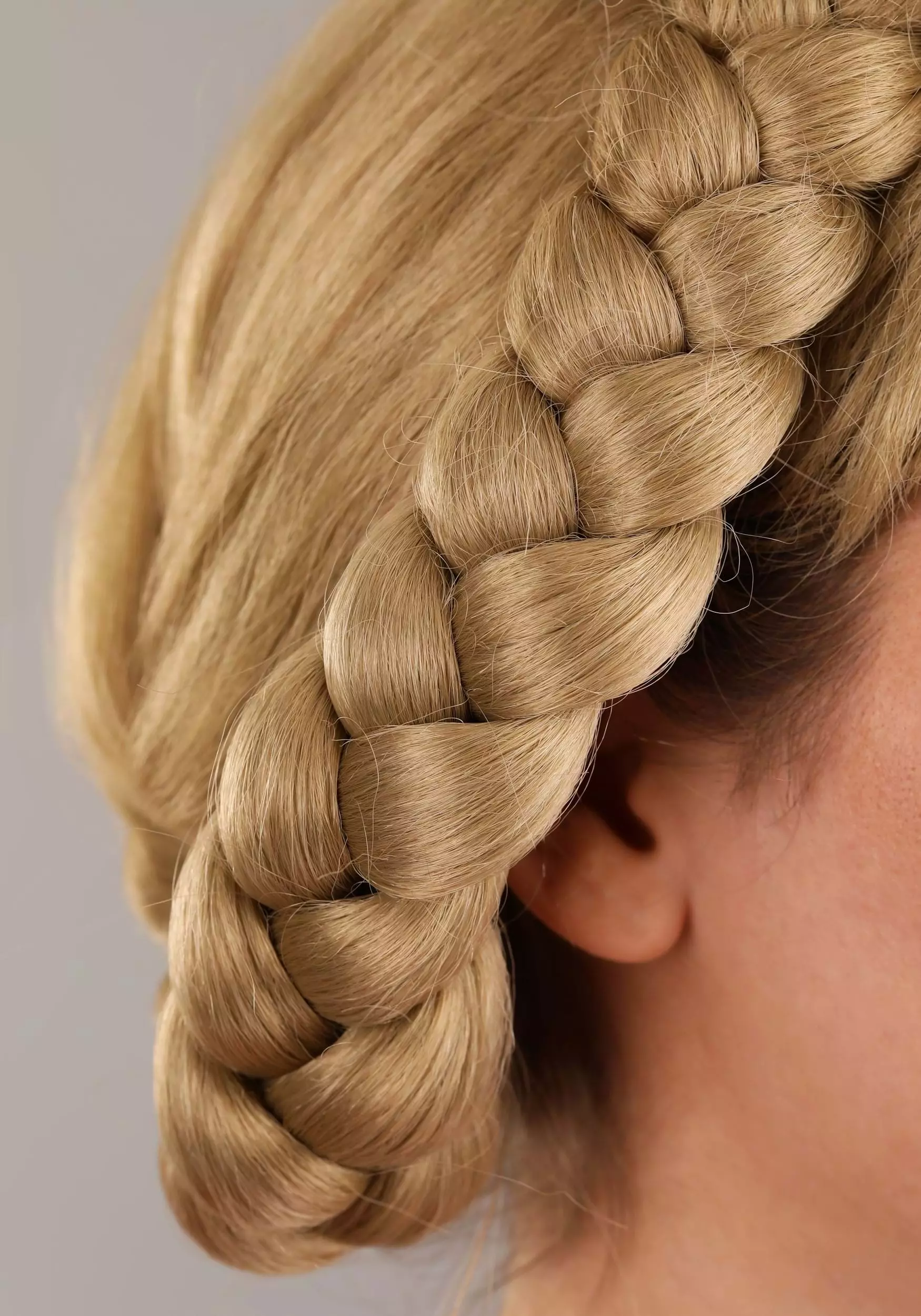 - Styled with puffy topknot, short bangs, thick braid at each side