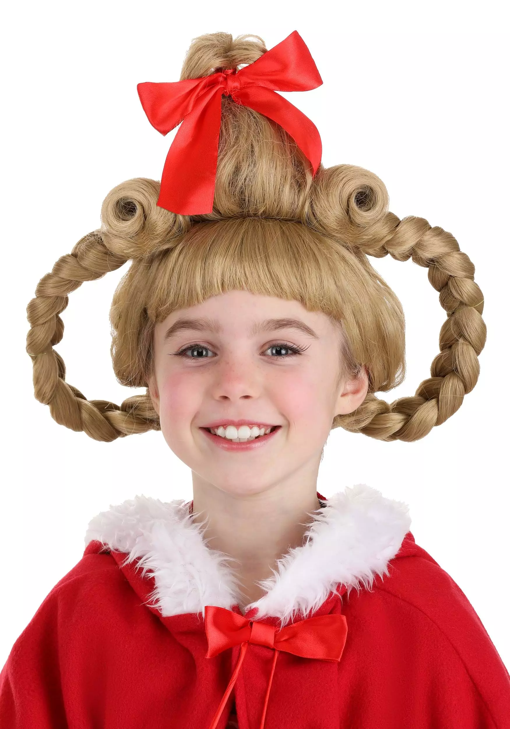 Help your friends discover the true meaning of Christmas by wearing this exclusive Deluxe Christmas Girl Wig for Kids! A mesh wig cap with a fitted edge is concealed under blonde synthetic hair that has been ornately styled. Two braids loop up the sides to finish in two big curls. A topknot of hair in the middle is tied with a red bow!