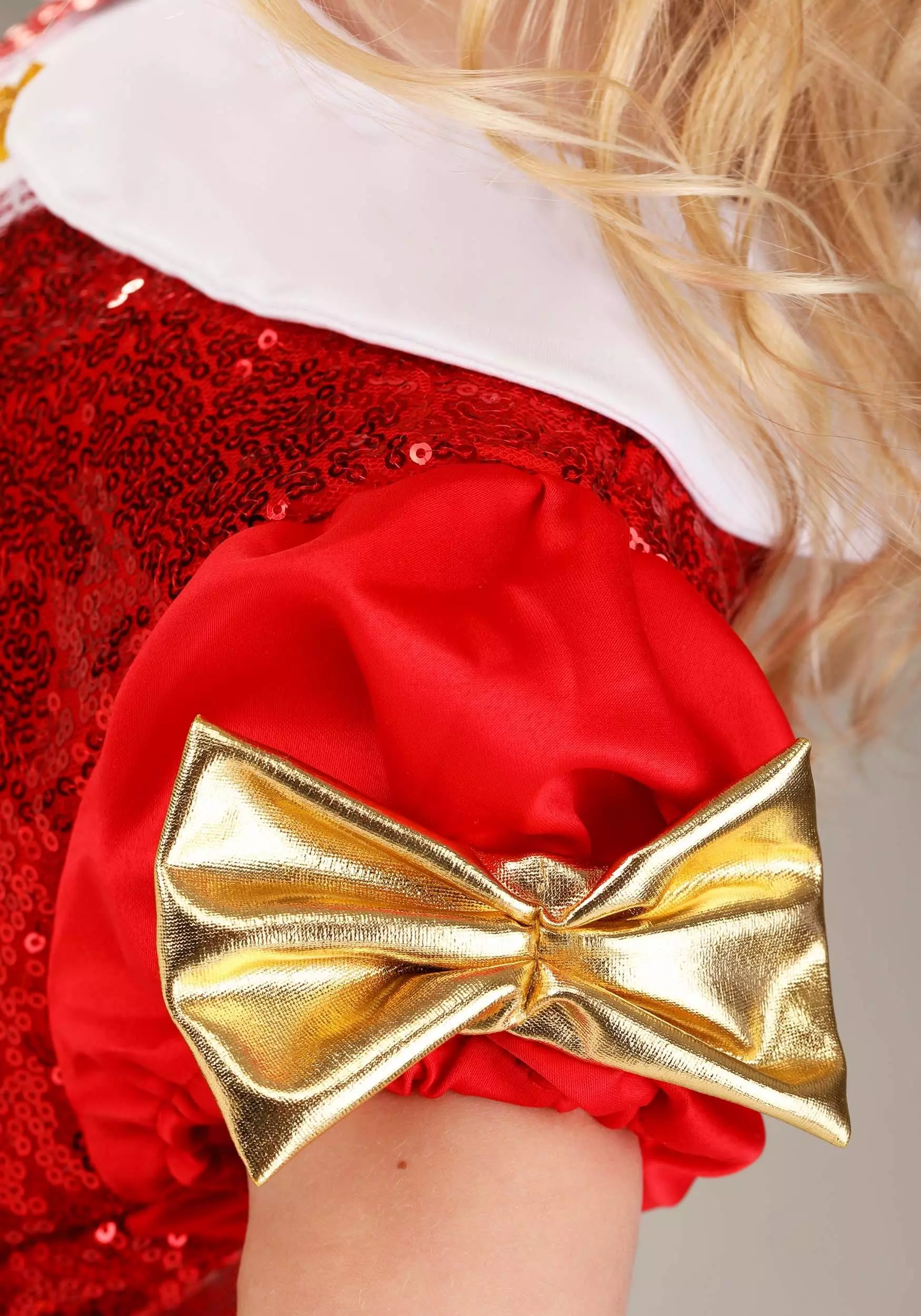 - Red sequins top w/ satin white strip, lace details, felt glitter snowflakes