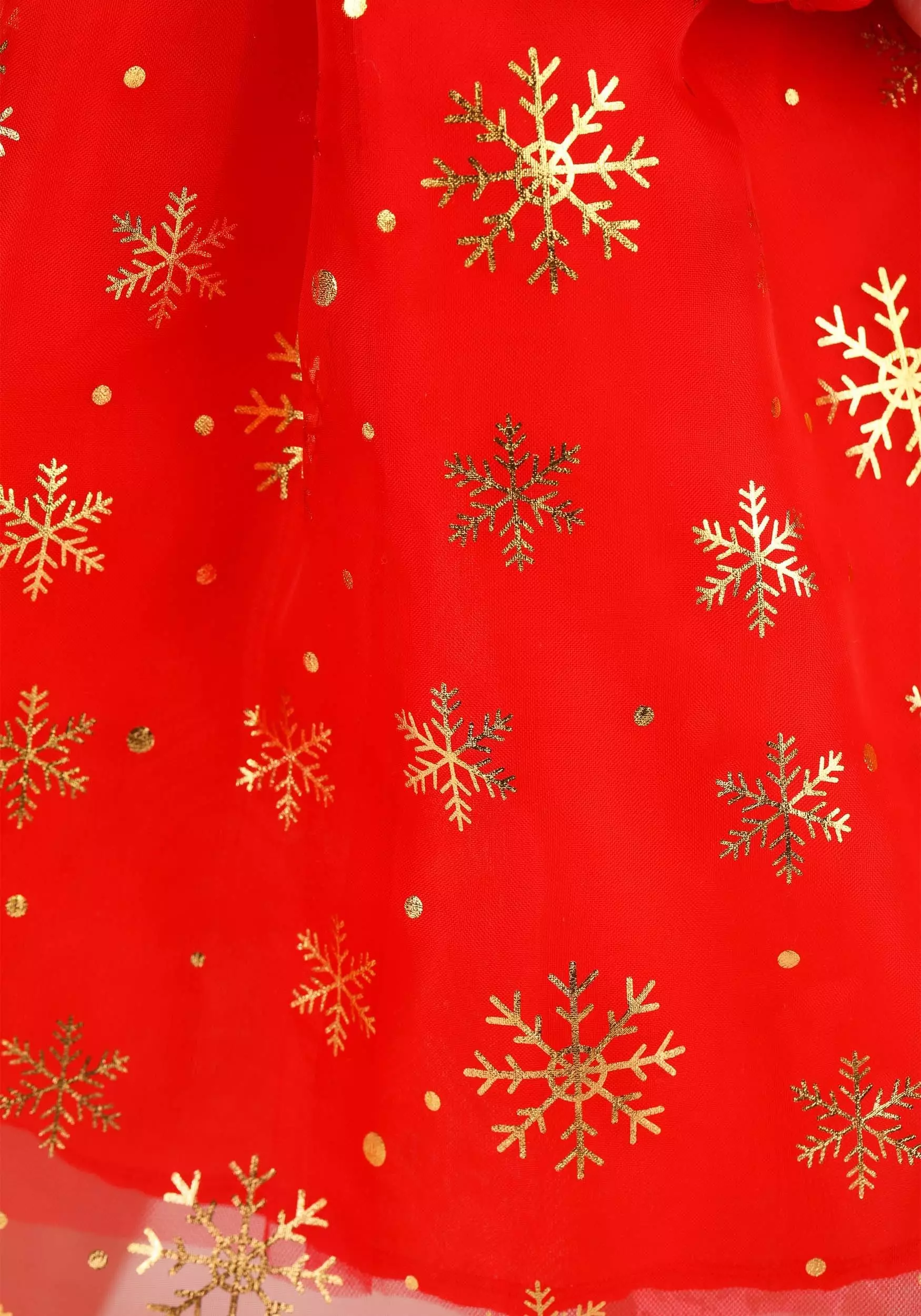 - Organza skirt of dress has gold snowflakes