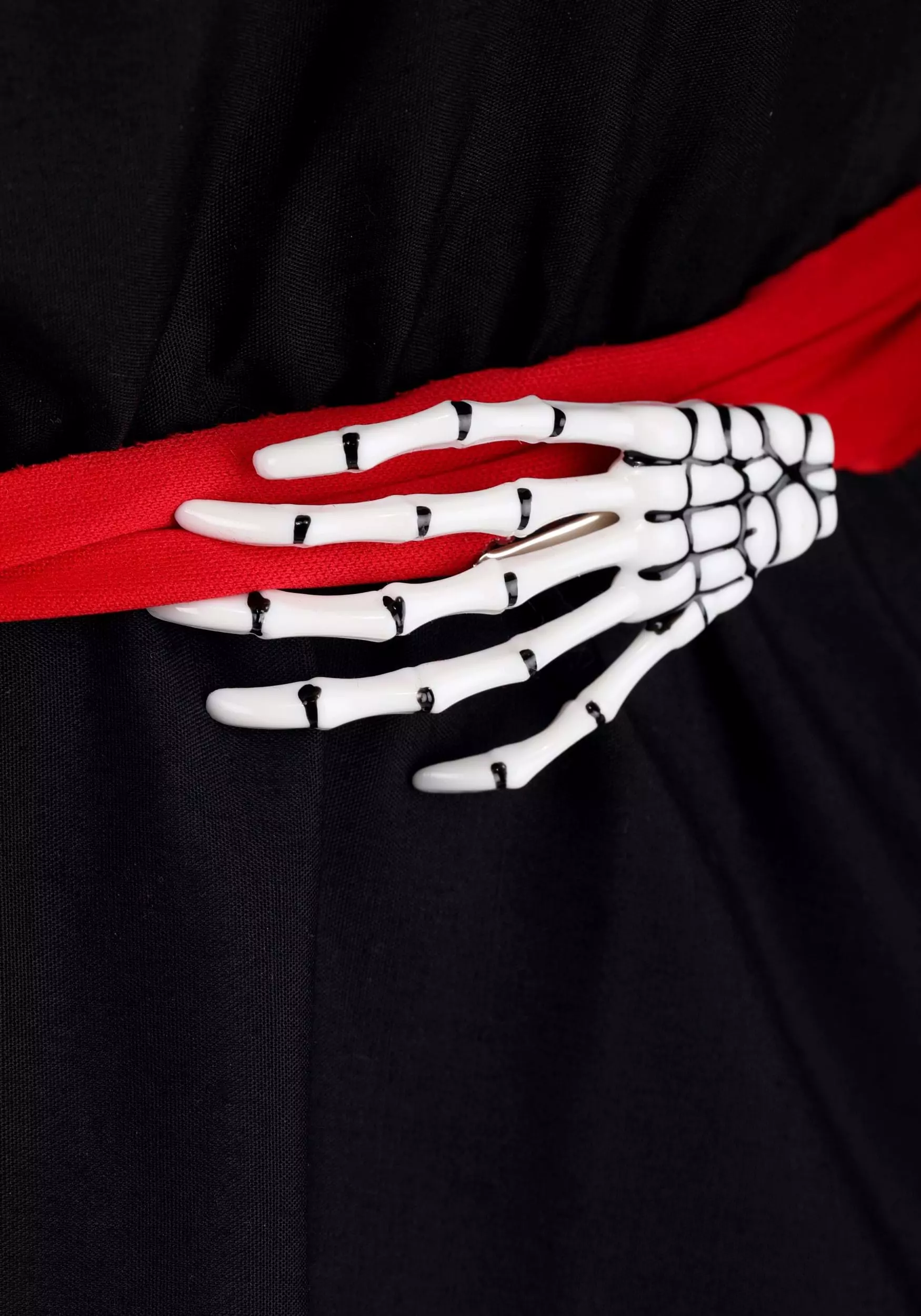 - Fabric waist sash has 2 plastic skeletal hands attached; tie as desired