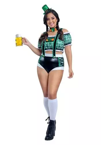 The mini shorts are decorated with a criss-cross pattern on the side, hinting at Irish dance costume influences. Complete with a satin bow and shamrock choker as well as a sparkly top hat, this costume is ready to toast with the most as soon as it arrives!
